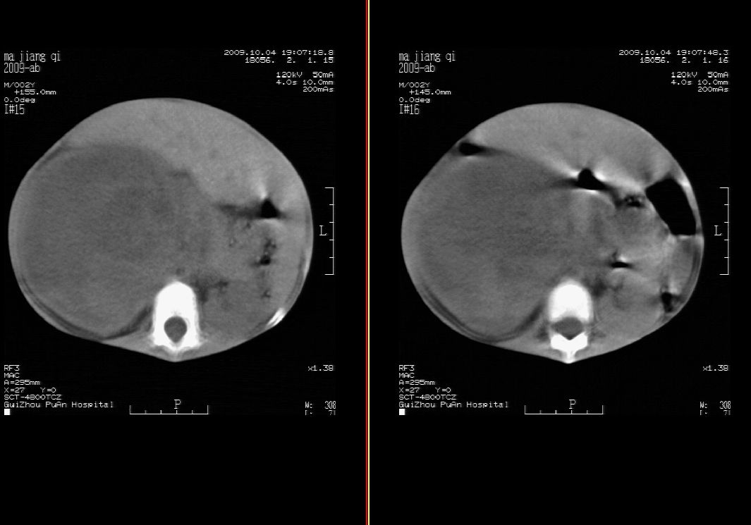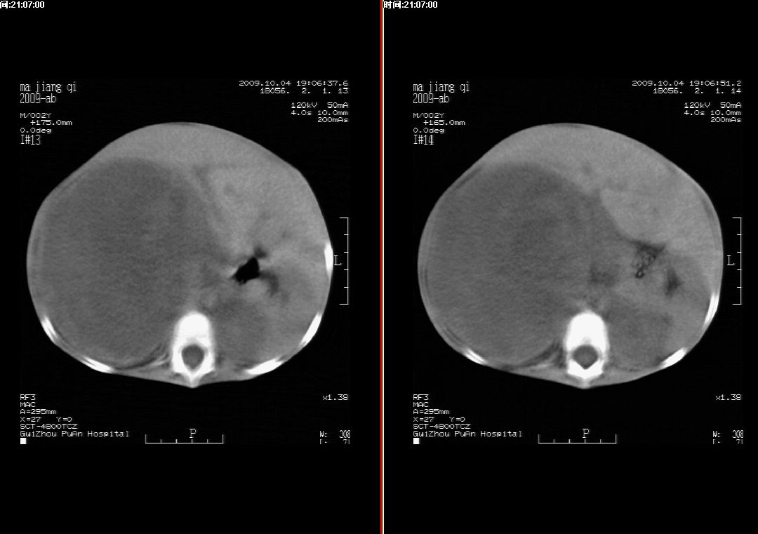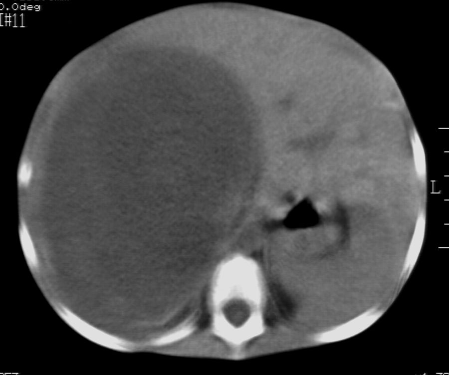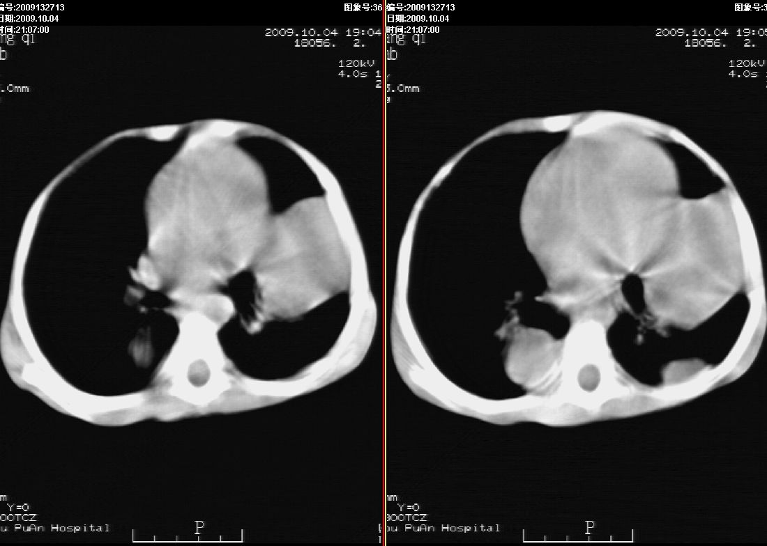 右肾巨大囊性占位病变,其内密度不均,正常肾结构消失,肝脏,肾上腺及肠管等受压移位。双肺内多发大小不等的结节及块状影。考虑右肾母细胞瘤伴双肺多发转移。