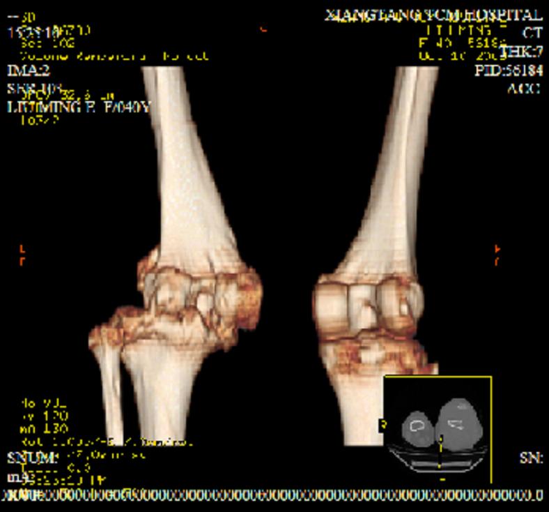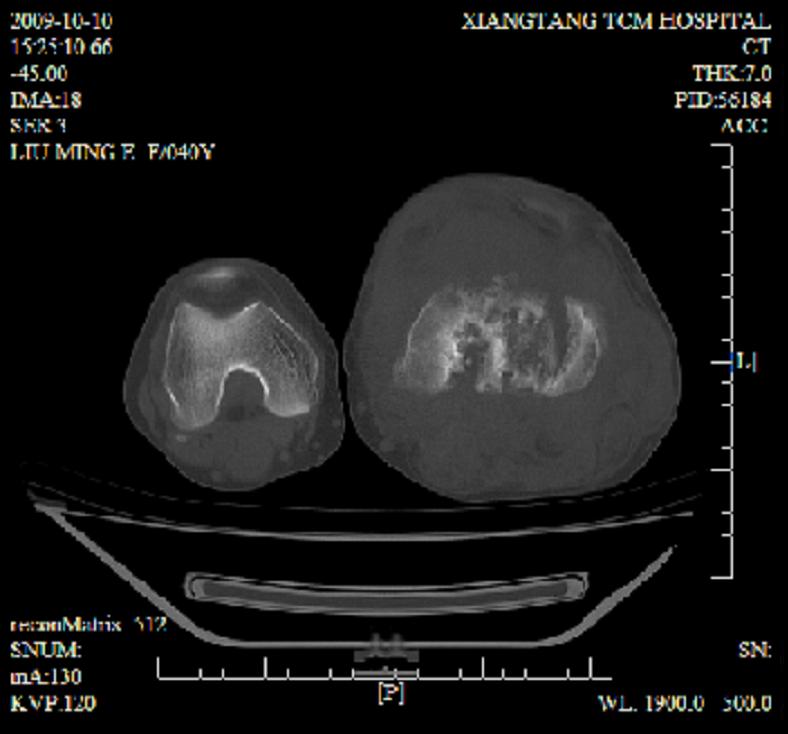 病史,f,43y,右膝关节肿块20年,18岁时曾在部队医院做过右膝肿块手术,医生建议截肢,具体病理不详,曾有过外伤,近年有右膝脱位外伤史,无红肿发热等.