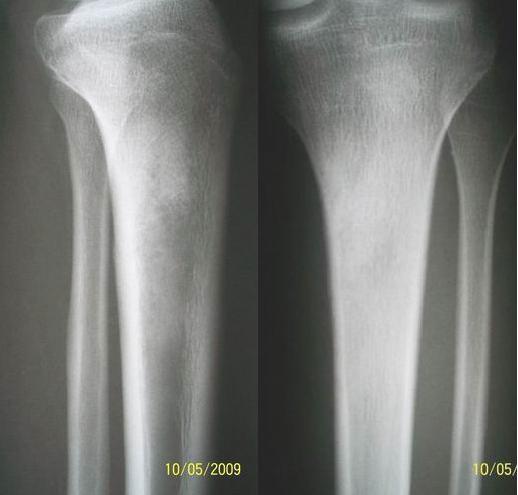男,16岁,胫骨近端疼痛月余,压痛明显,轻度肿胀,无发红,无其他临床征象。图片如下