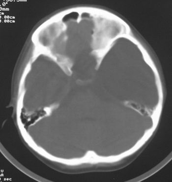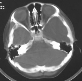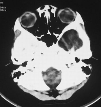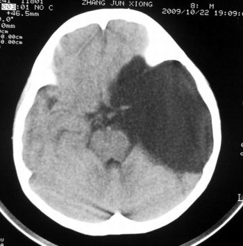 典型的左中颅窝蛛网膜囊肿。最常见的发病部位,张力比较高,相应颅板受压变薄。赶紧治疗,脑组织的功能可能部分恢复。