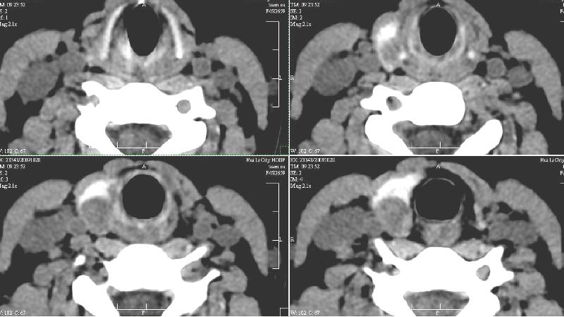 ct:双侧多发性甲状腺占位,考虑多发性甲状腺腺瘤伴部分腺瘤内出血可能大。