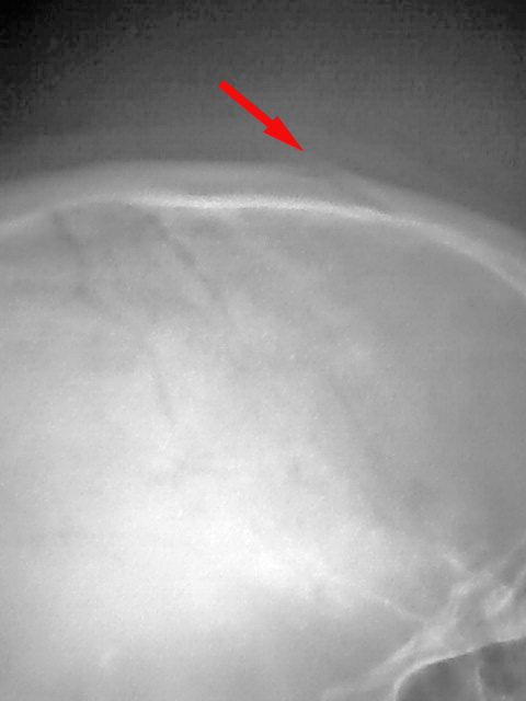 未见明显凹陷骨折征象,要是锐器伤倒是支持支持,可结合患者外伤部位观察;另外头颅外伤即使没有骨折也并不代表没有问题,还是结合ct或mri检查好一些。