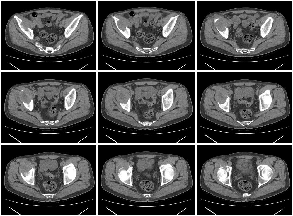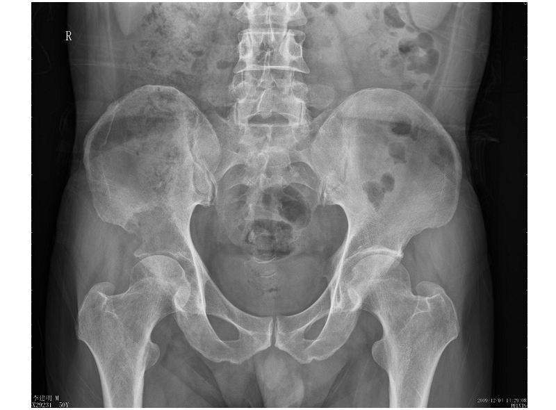 右侧髂骨溶骨性骨质破坏,且见有软组织肿块,首选考虑转移瘤,其次考虑淋巴瘤或骨肉瘤。