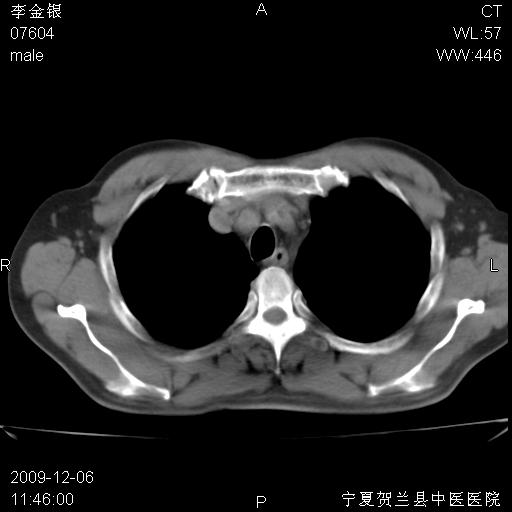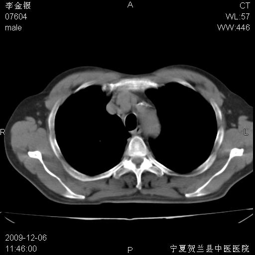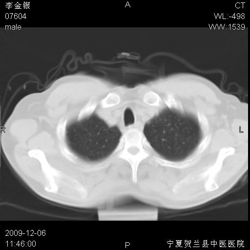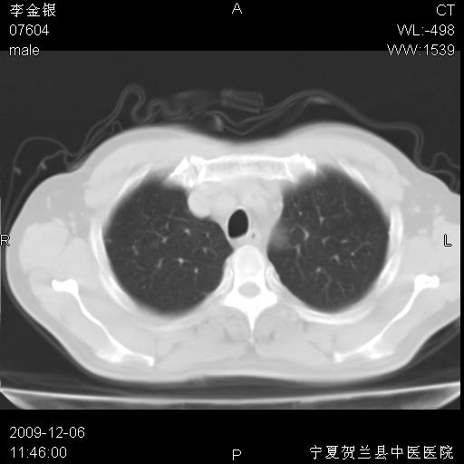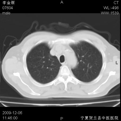 右肺上叶中心型肺癌,阻塞性肺炎、右肺门和纵隔淋巴结转移。