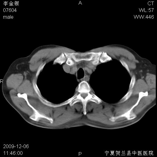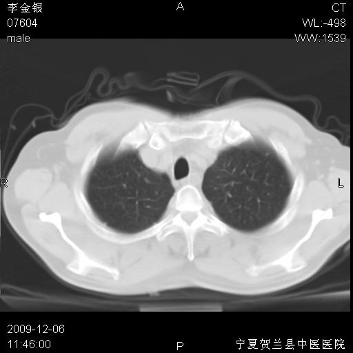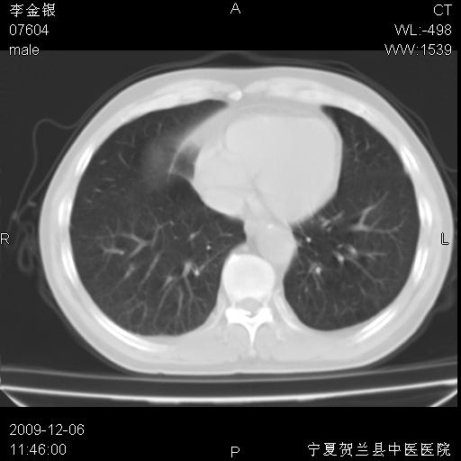 右上叶支气管狭窄,管壁增厚,远端斑片状软组织影,病灶邻近叶间裂,叶间裂无移位。