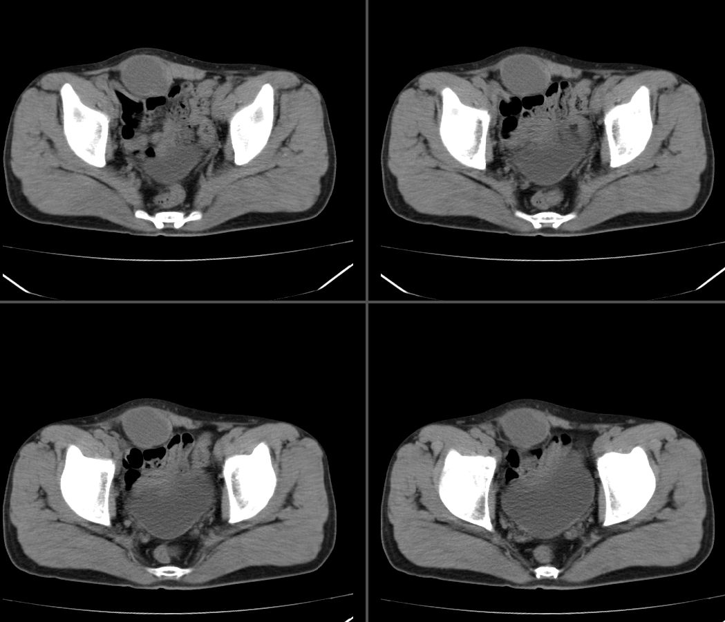 病灶特点:分界清,边缘光整,囊性密度,病灶成长椭圆形,病灶处腹直肌受压萎缩,病灶与膀胱处有相似密度管状灶(该征象因肠道未作准备,不能确切)
