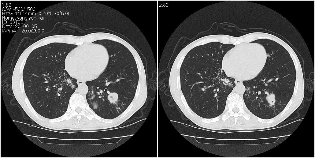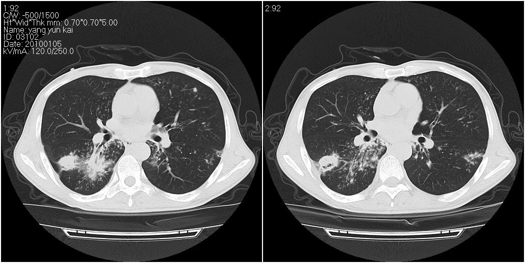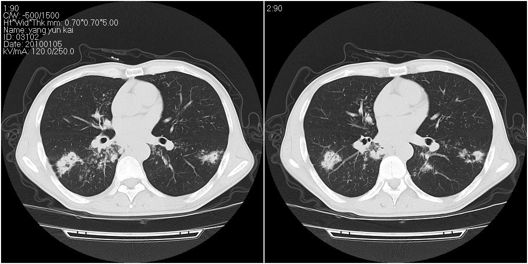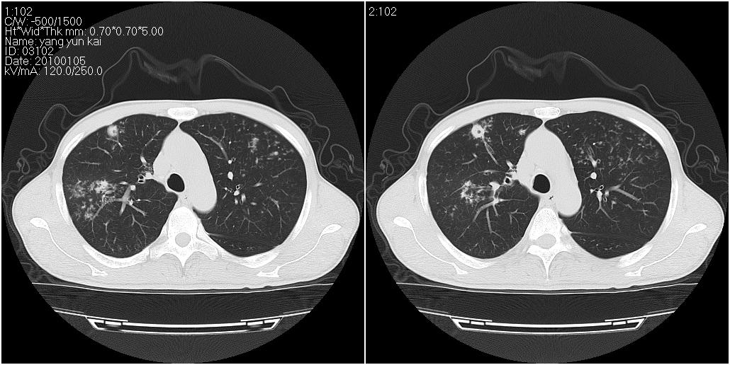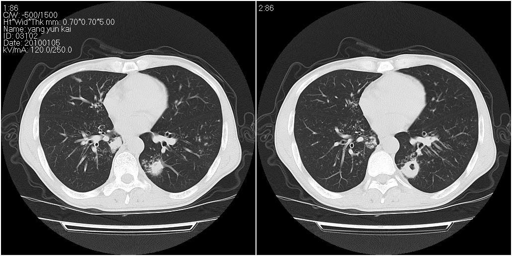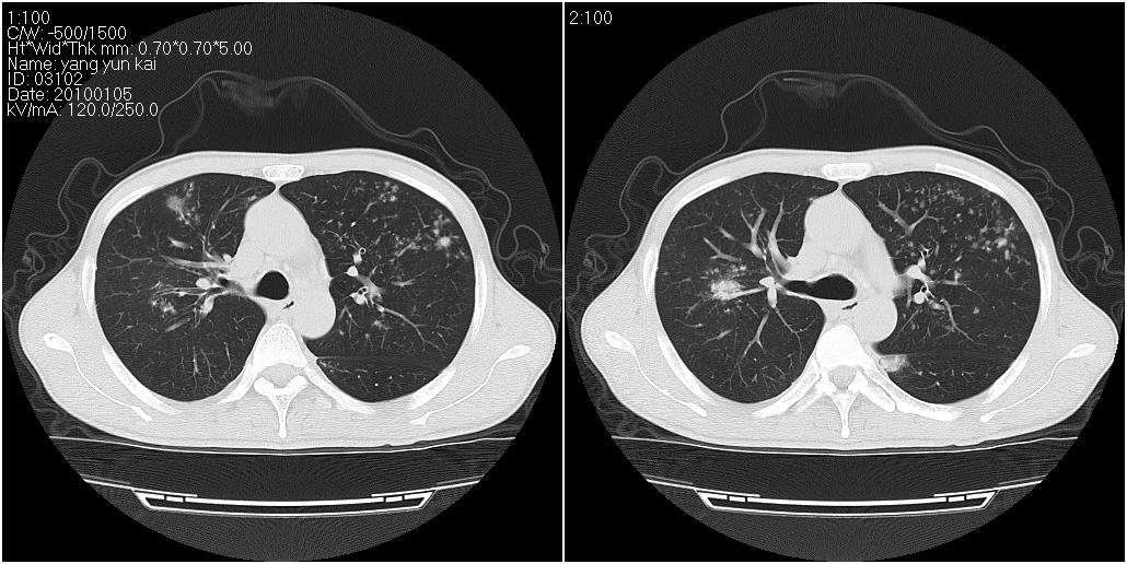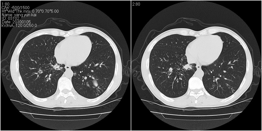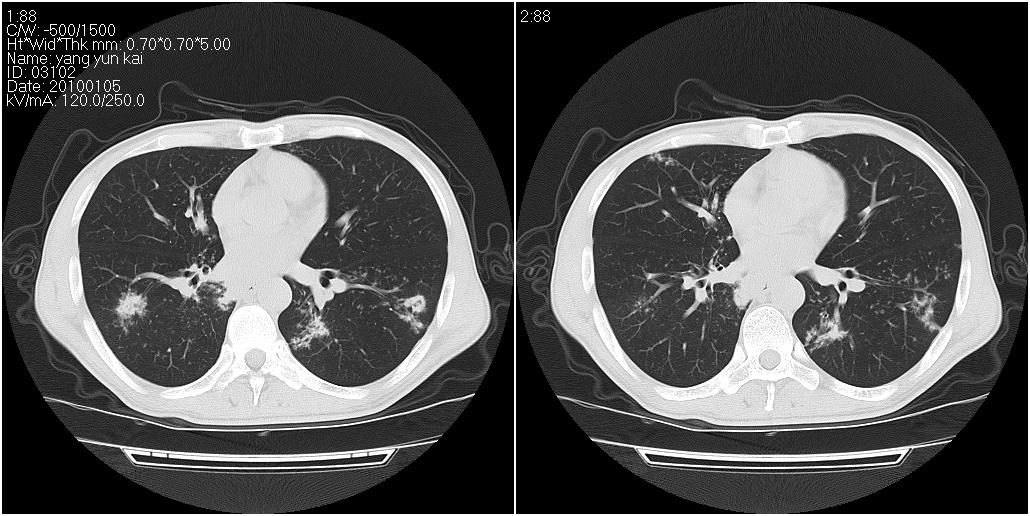 两肺继发性肺结核并多发性结核球形成,部分病灶内空洞形成。