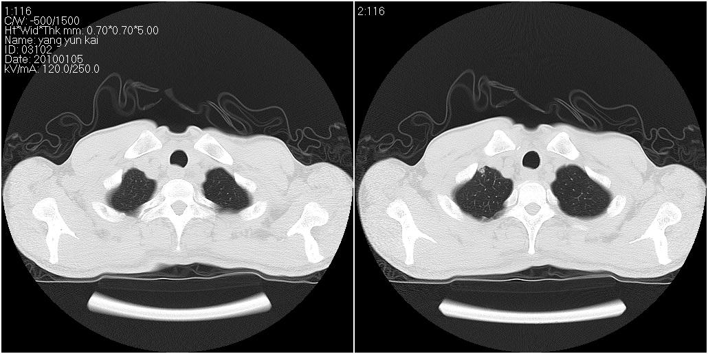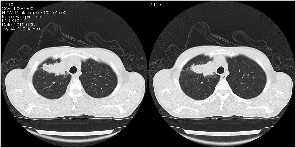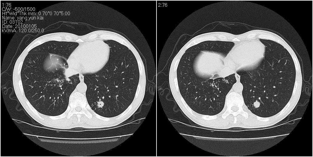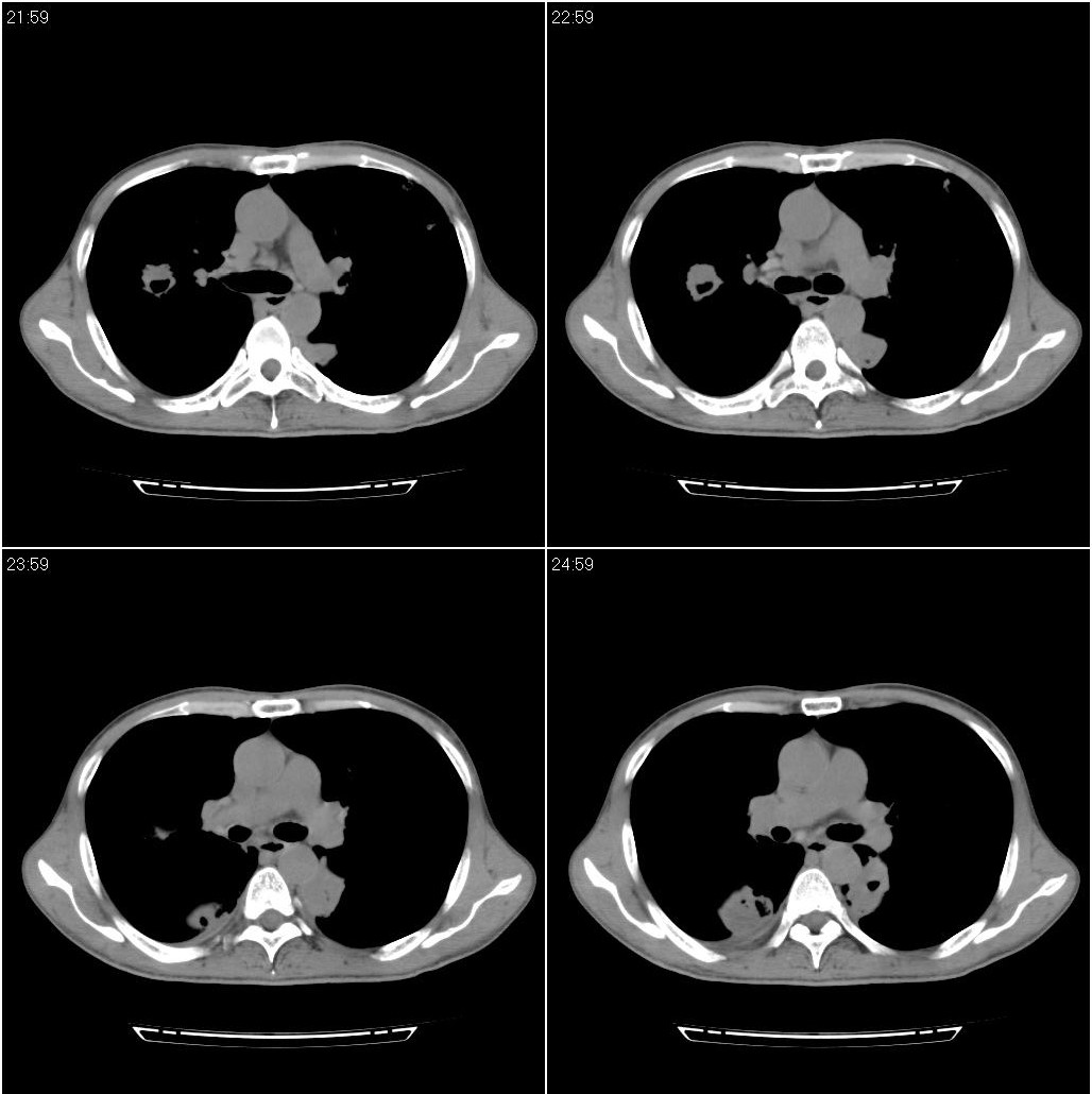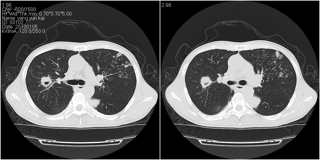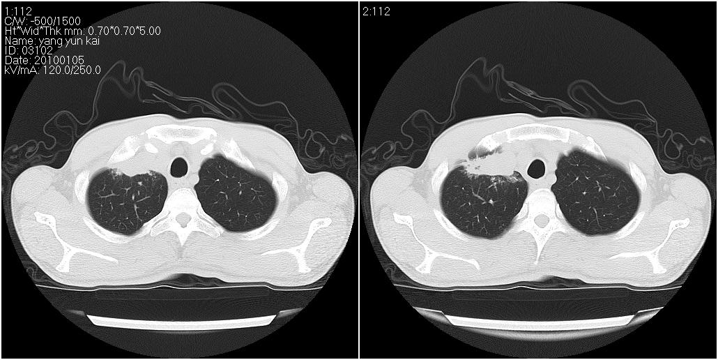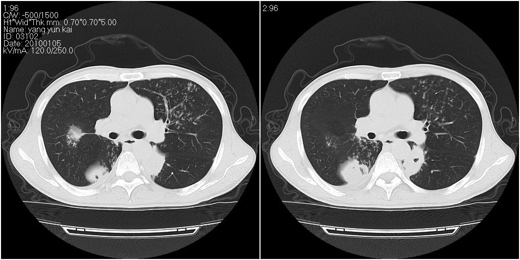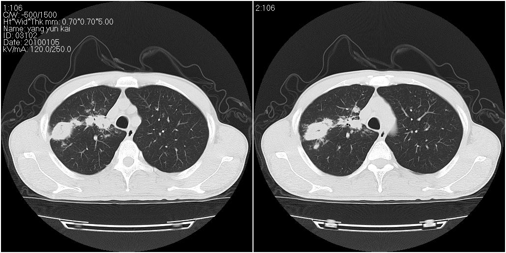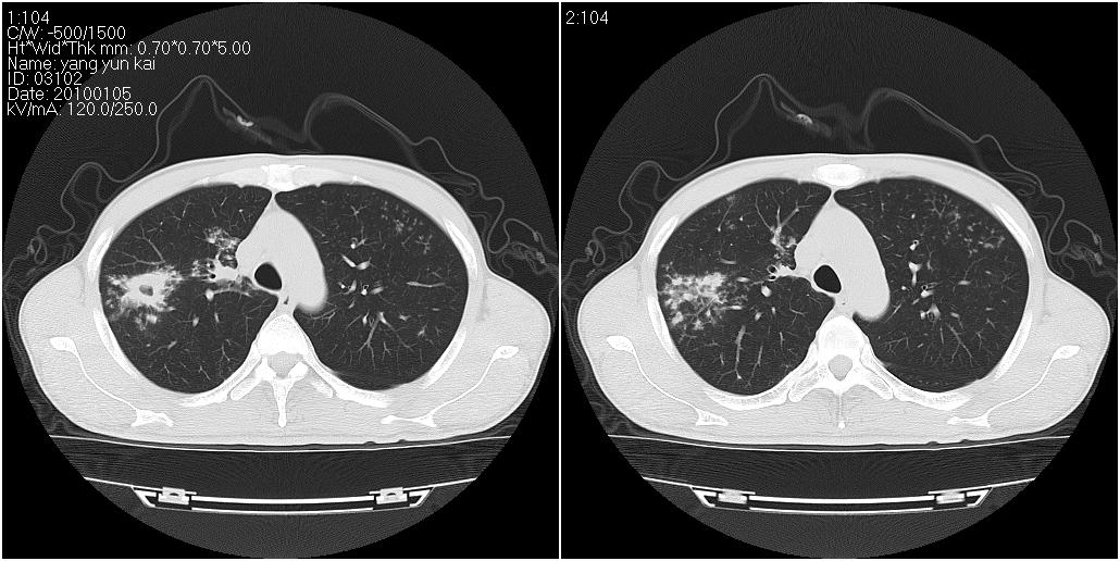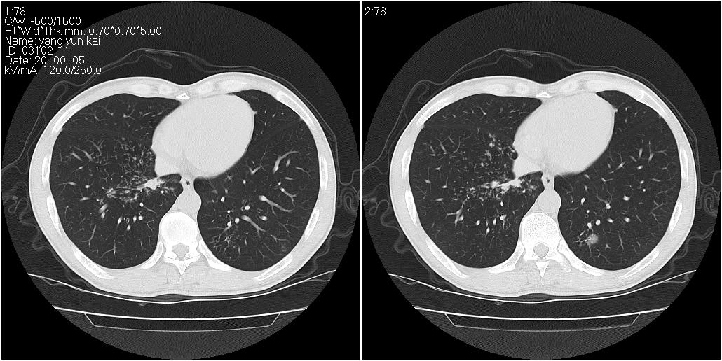 标题: CT23980:男性,47岁。近来咳痰、咳血,血沉增快(40左右),
