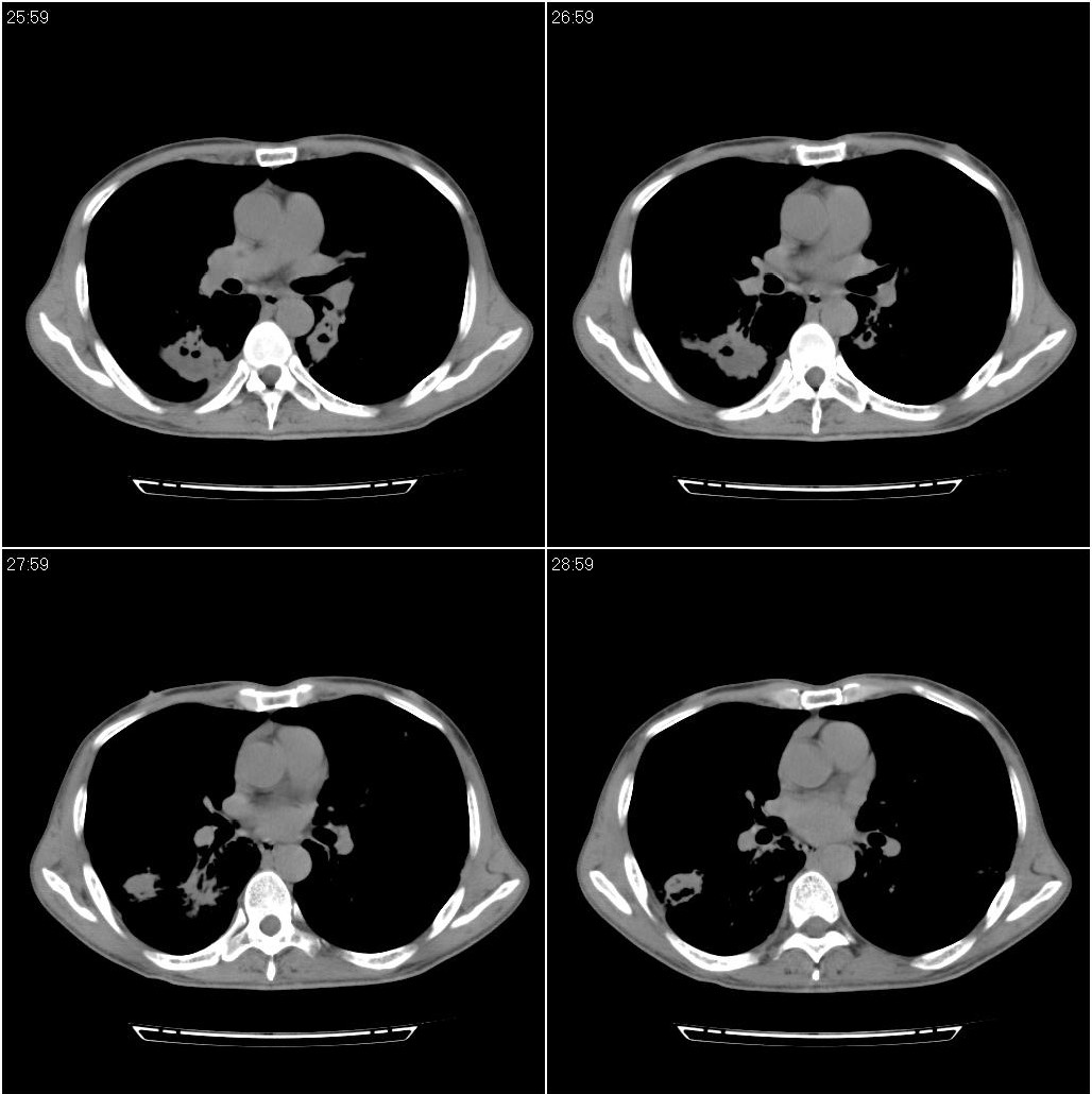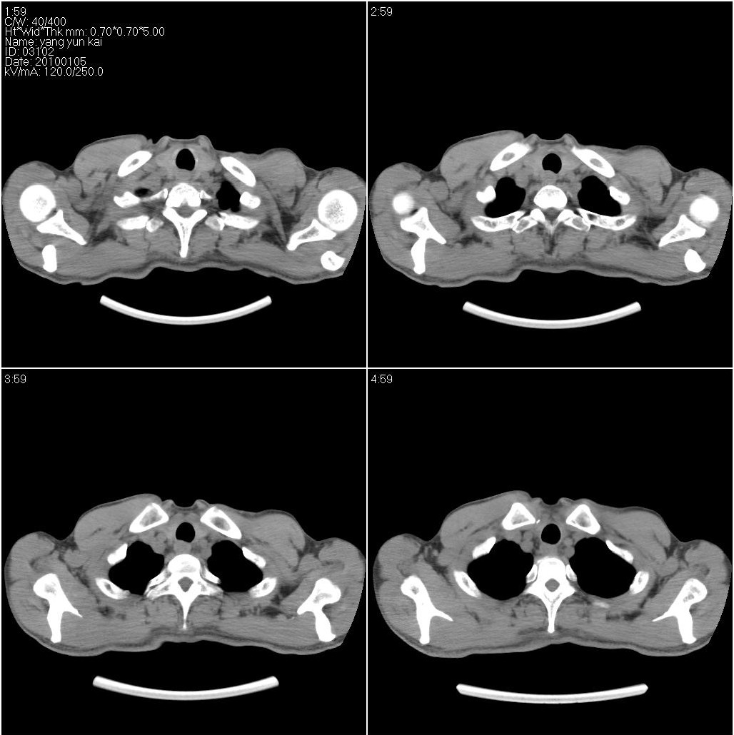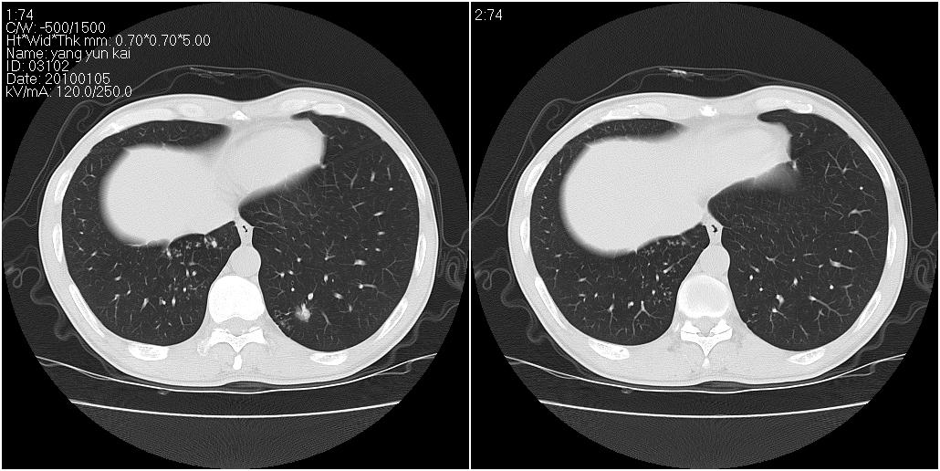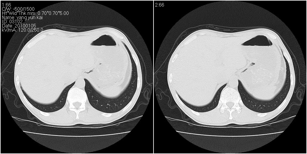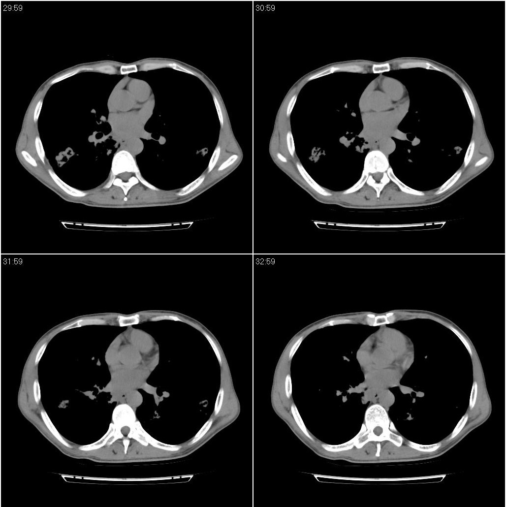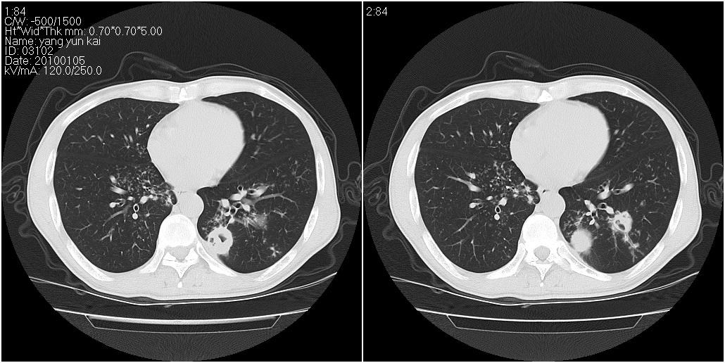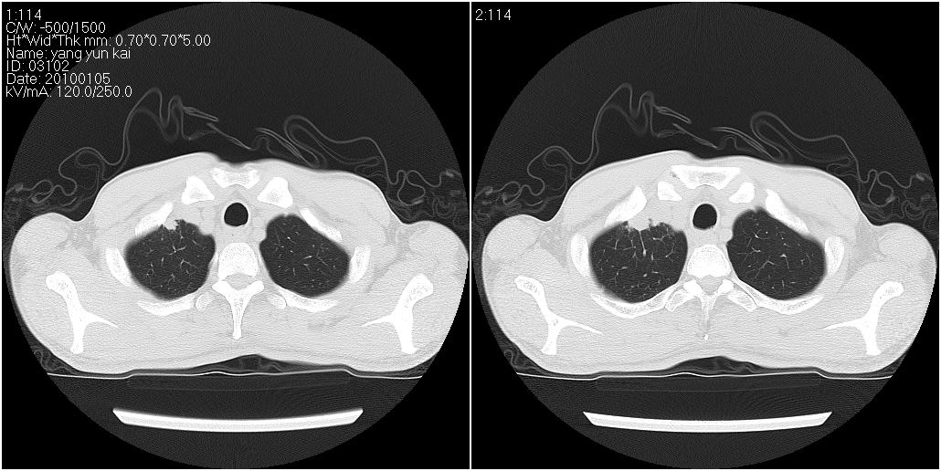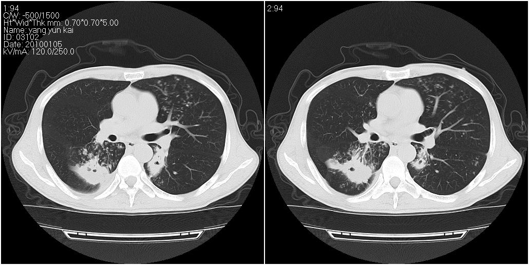 标题: CT23980:男性,47岁。近来咳痰、咳血,血沉增快(40左右),