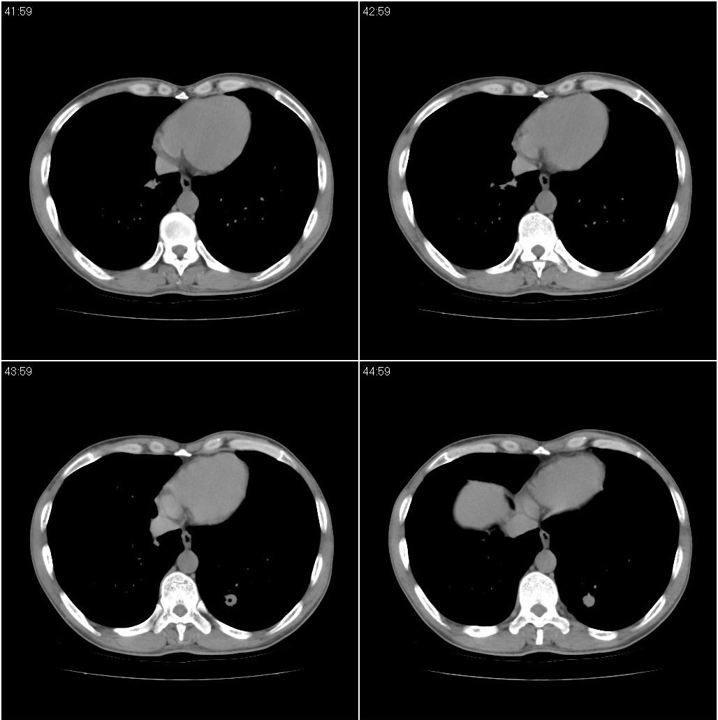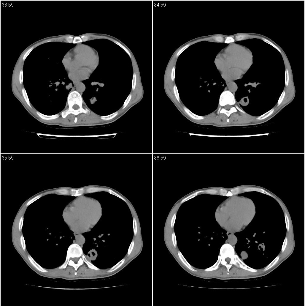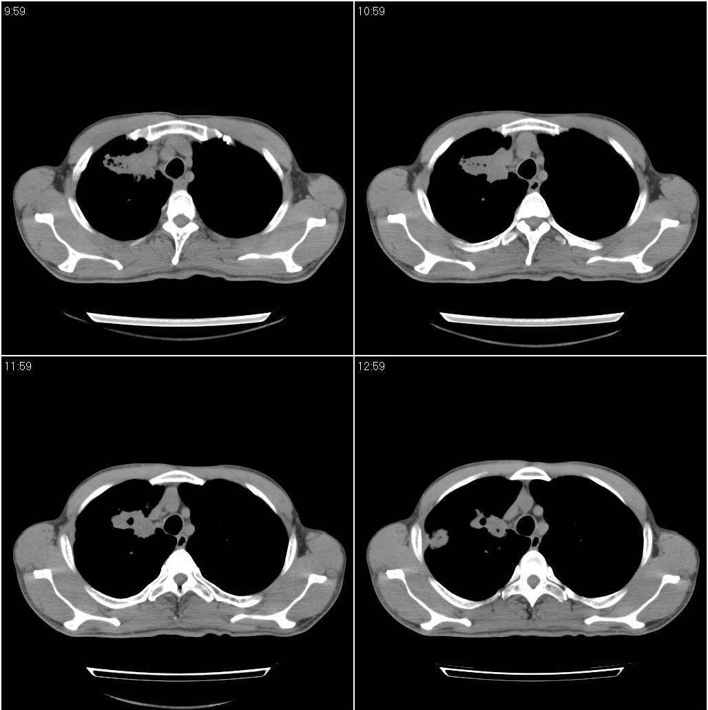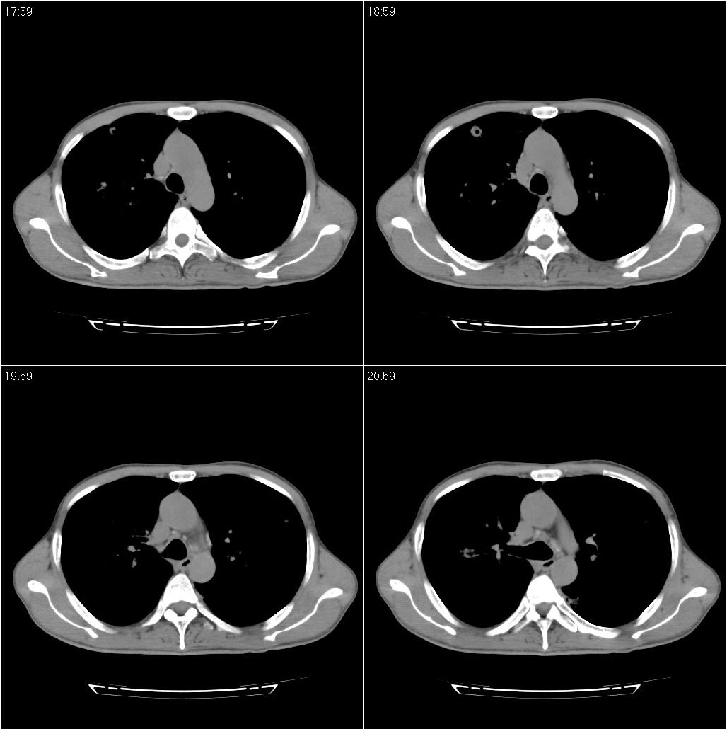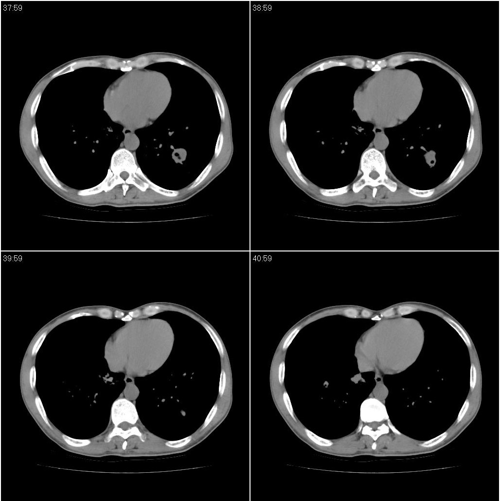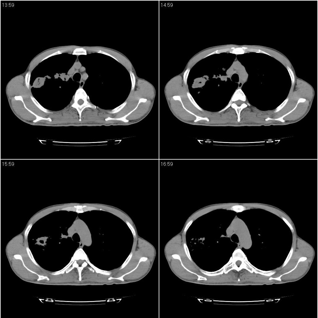 标题: CT23980:男性,47岁。近来咳痰、咳血,血沉增快(40左右),