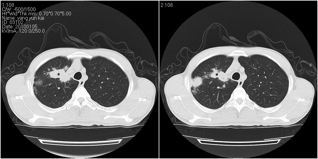 标题: CT23980:男性,47岁。近来咳痰、咳血,血沉增快(40左右), [打印本页]