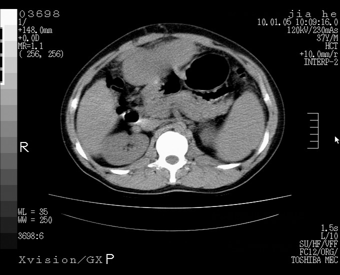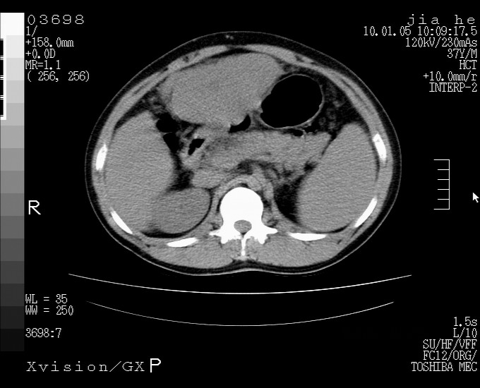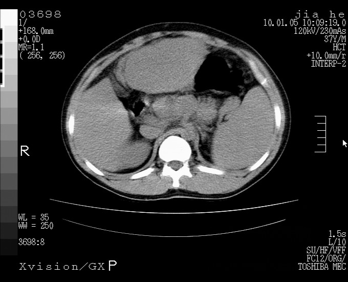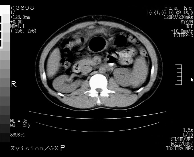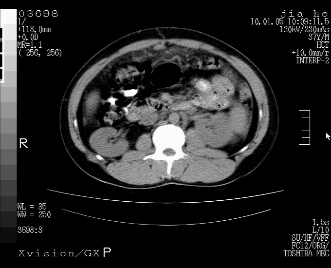 2.脾大,肠系膜密度增高,有多发索条影,胰腺边缘毛糙,腹膜增厚,推测有肝硬化,门脉高压,腹膜炎和/或胰腺炎