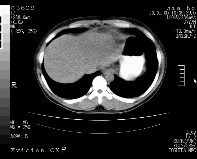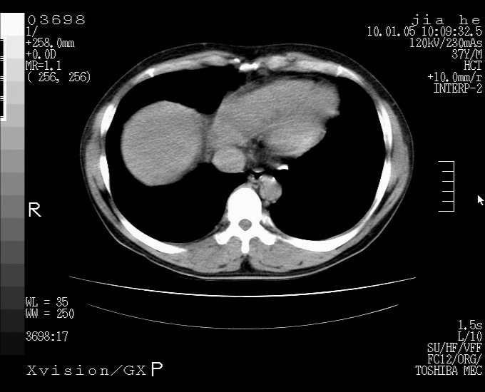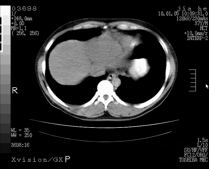 还有个异位胆囊。临床资料太少,肿瘤、左叶发育异常、肝硬化。不过看密度是个低密度为主的,新生物倾向于第一位。强化吧!