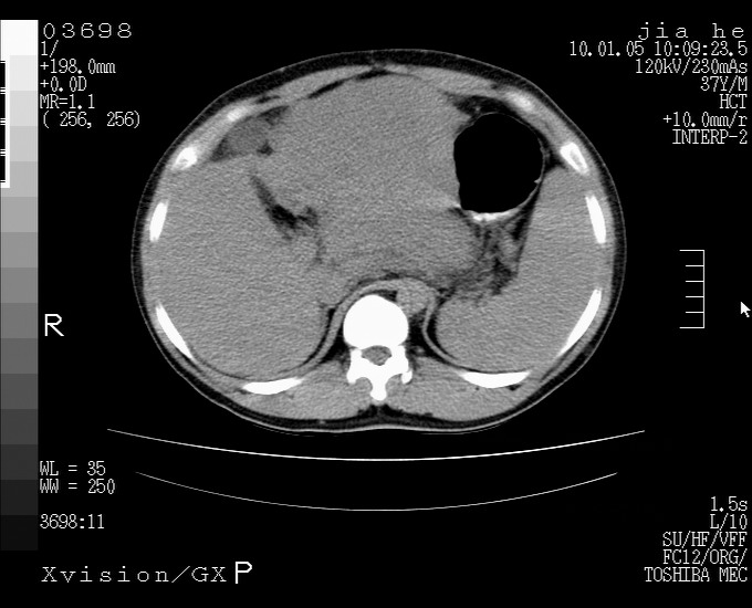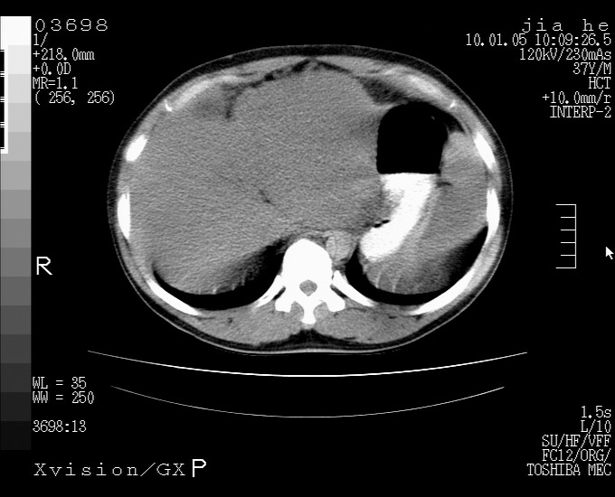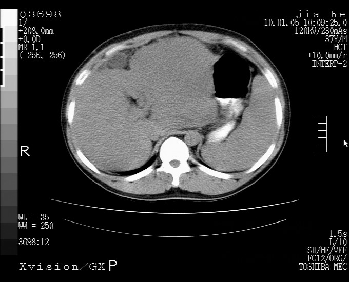 3.肝左叶巨大站位,并腹腔淋巴结肿大,肝癌或肝间叶来源恶性肿瘤,也不排除大网膜间质瘤侵及肝左叶