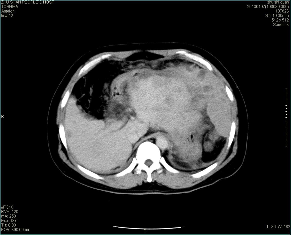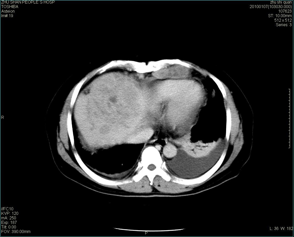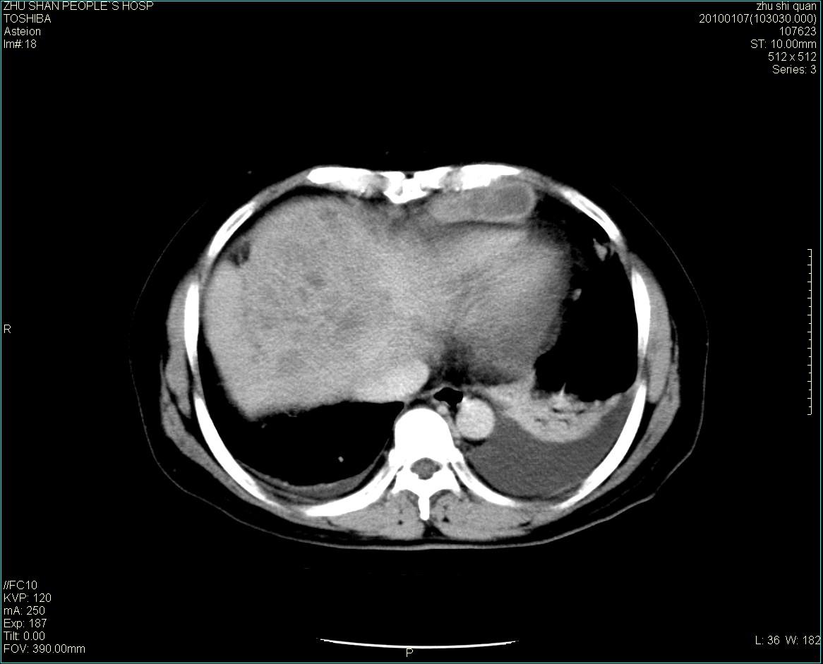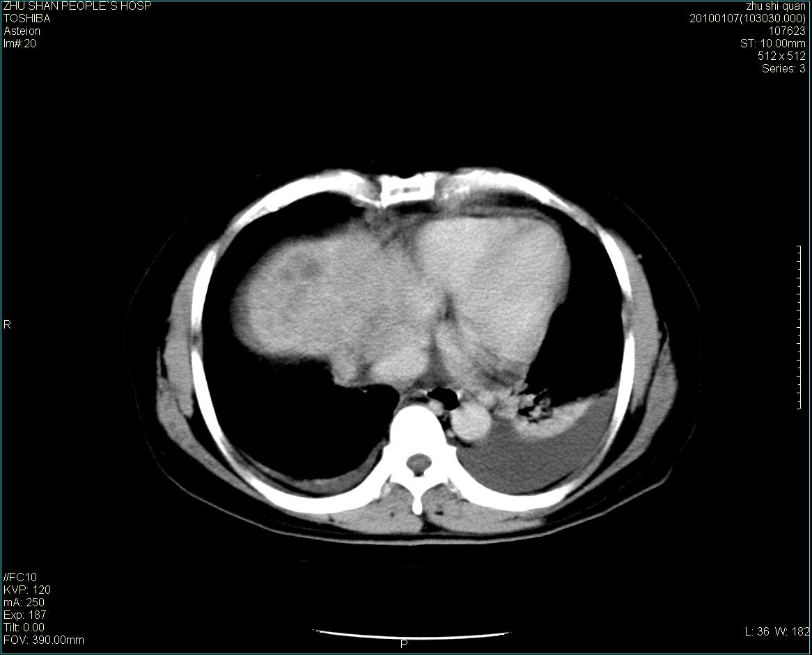 肝癌术后复发,肝内、脾脏、腹膜后及腹膜多发转移,腹水,双侧胸腔积液(以左侧为甚)伴左下膨胀不全。