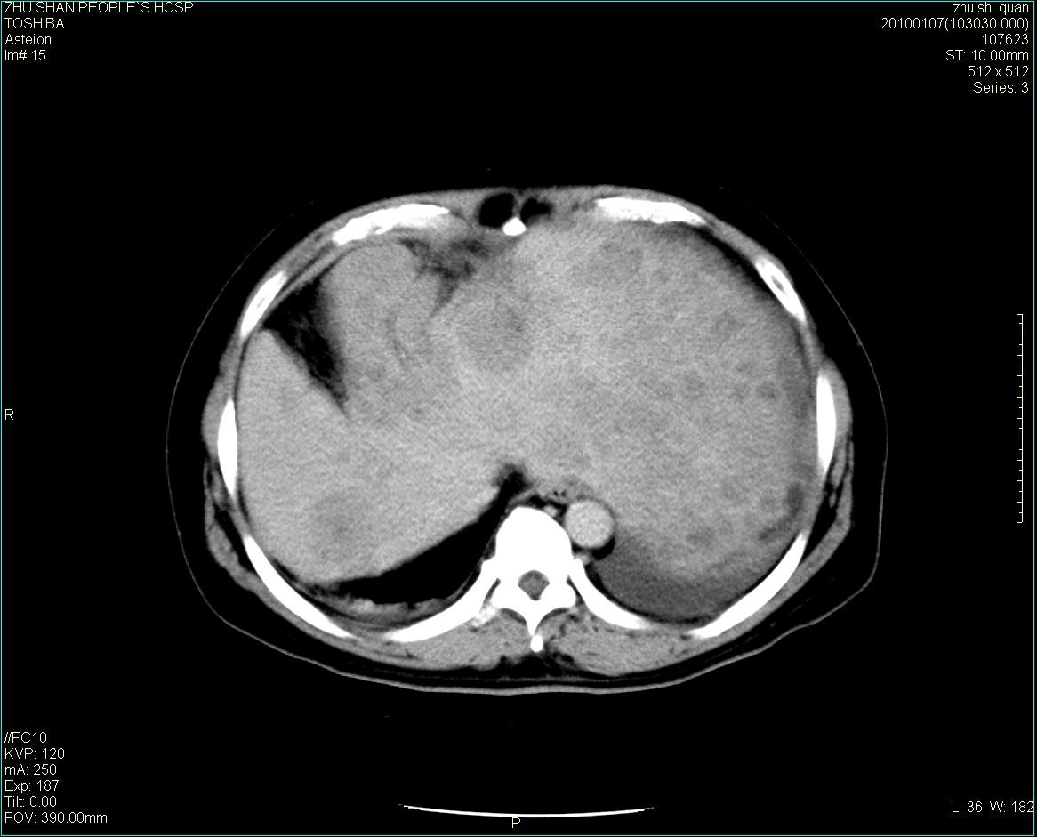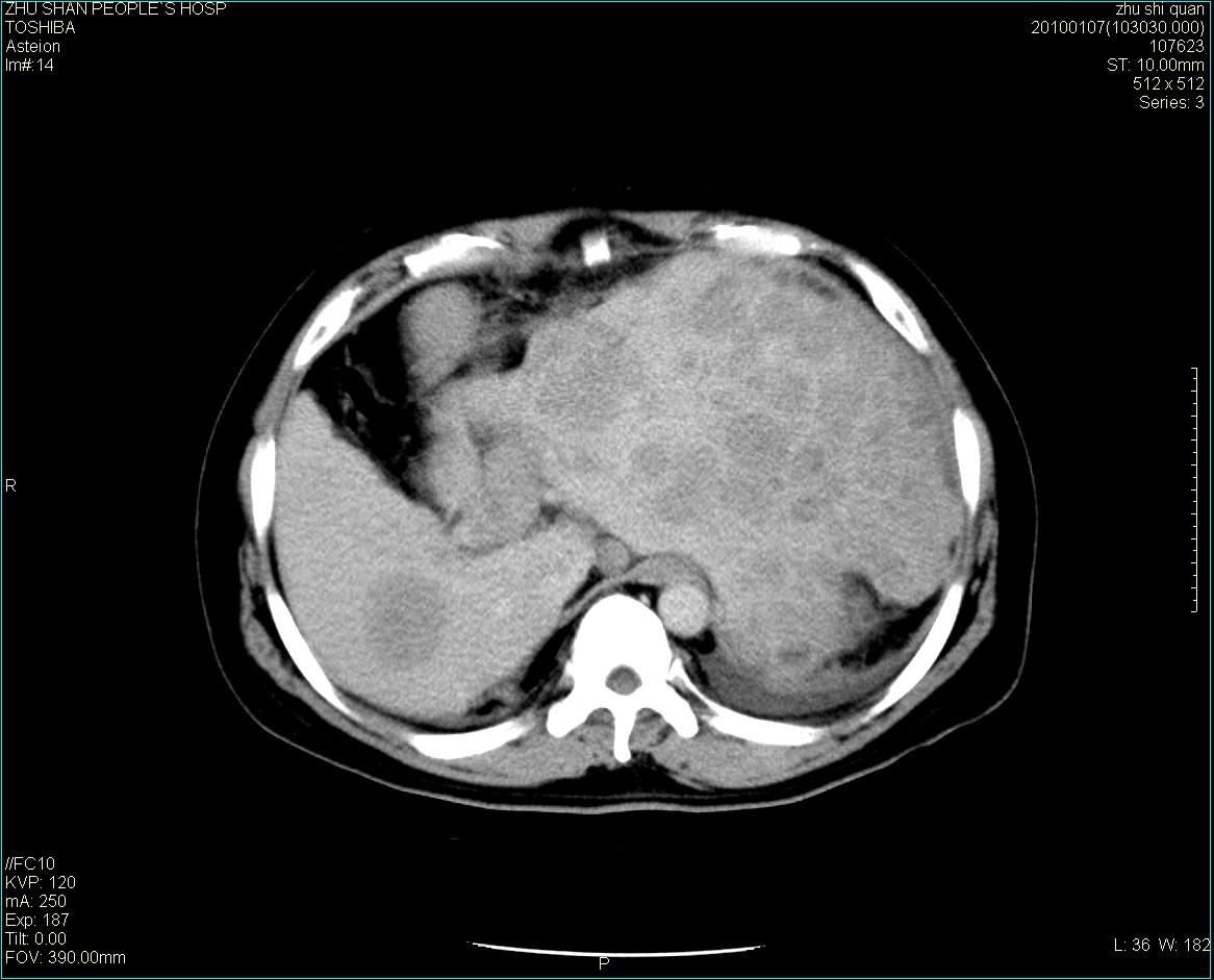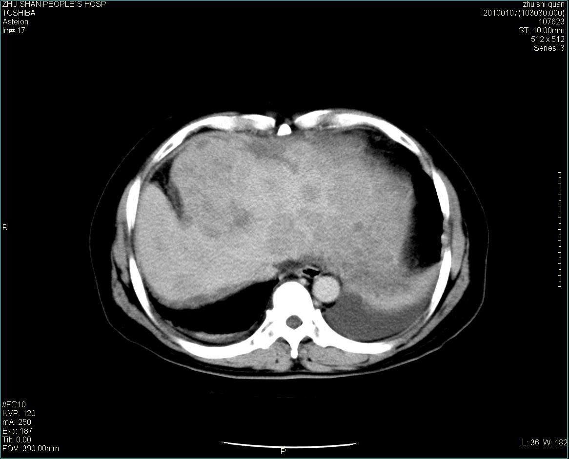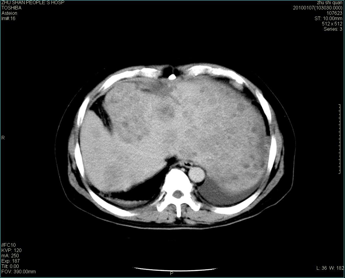 肝癌术后复发,肝内、脾脏、腹膜后及腹膜多发淋巴结转移,腹水,双侧胸腔积液。