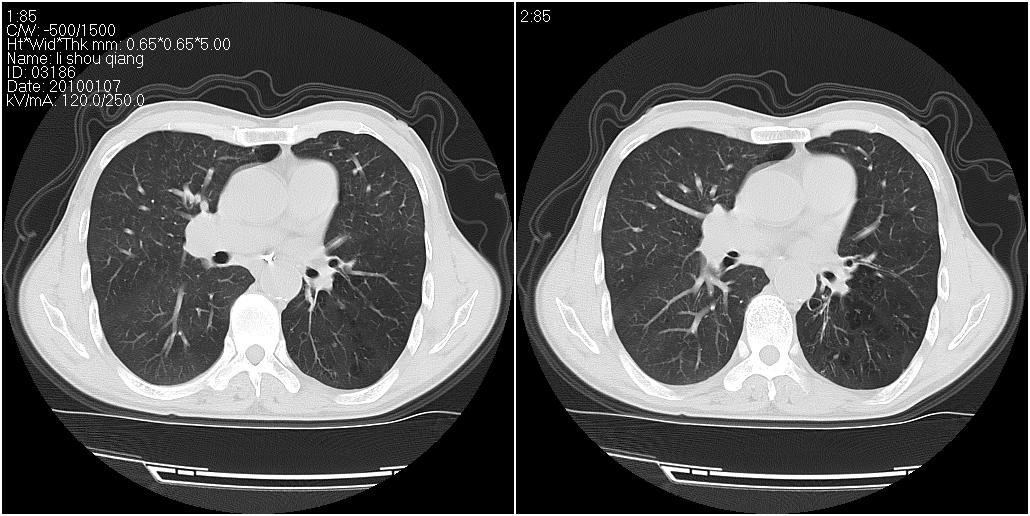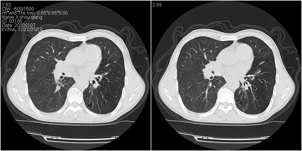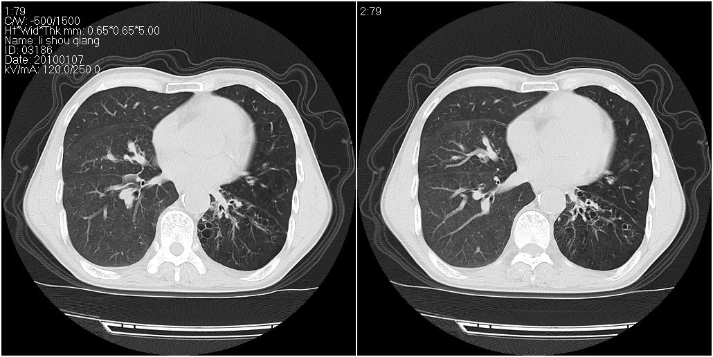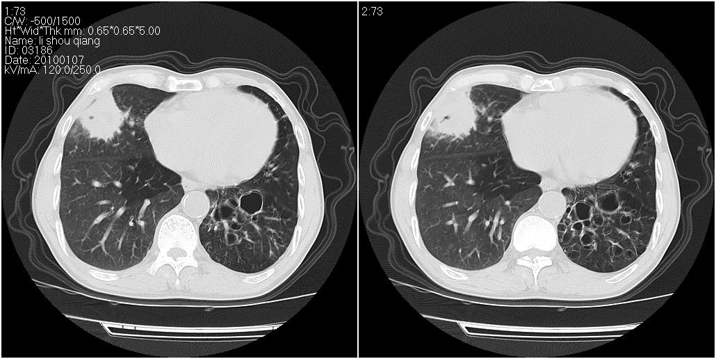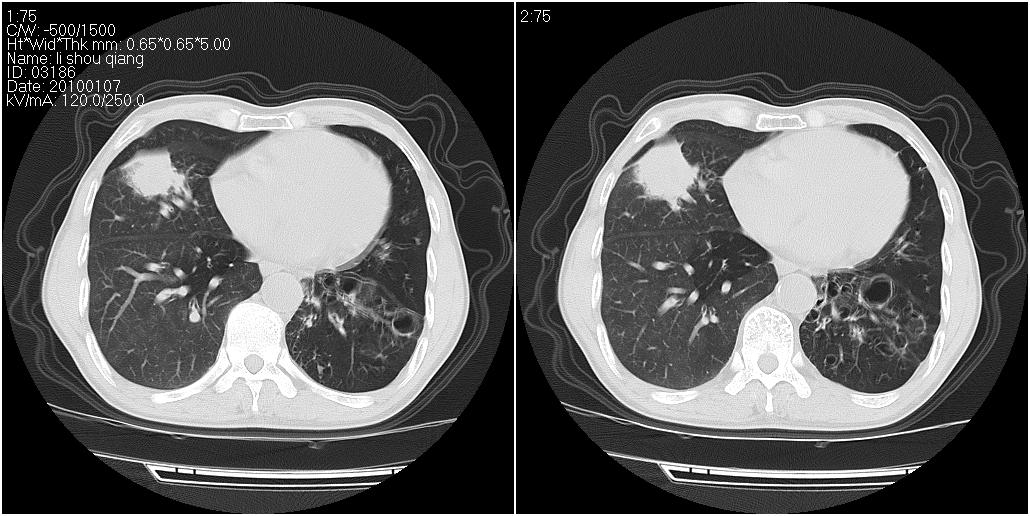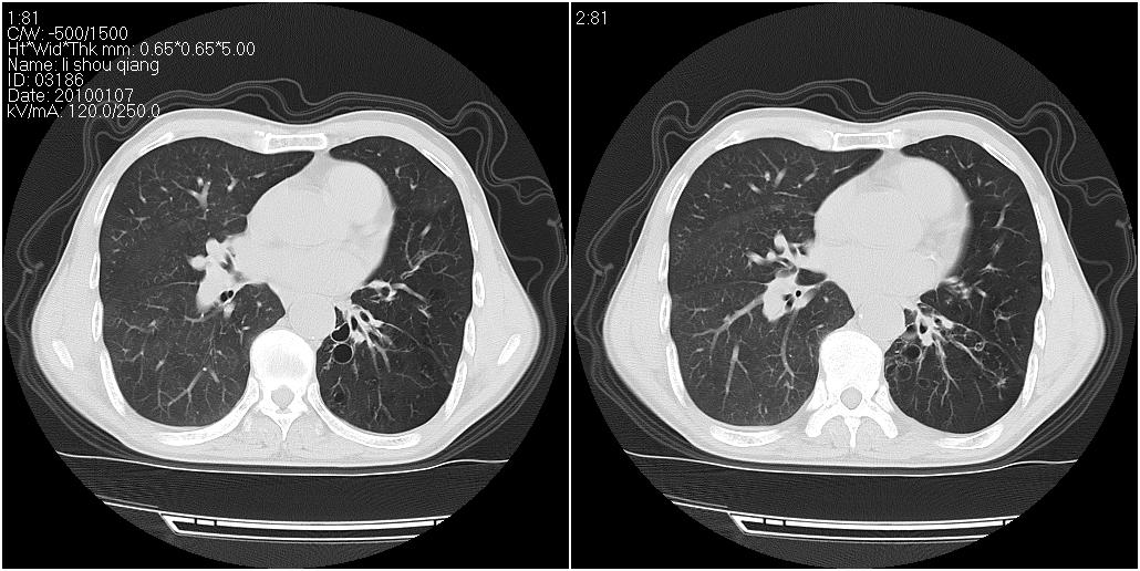 2、左肺下叶支扩,不除外合并肺囊肿。