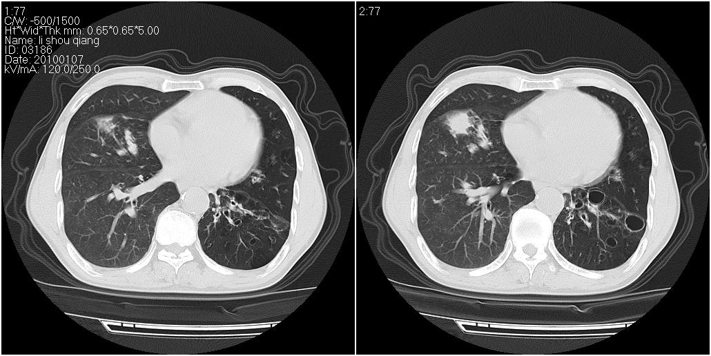病还不少。血管先天变异。支扩并感染。右肺可能合并霉菌感染或结核。