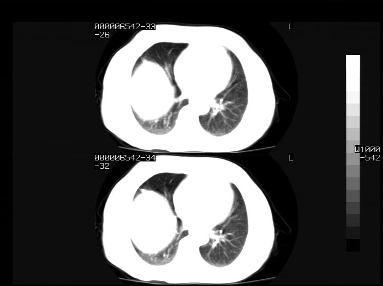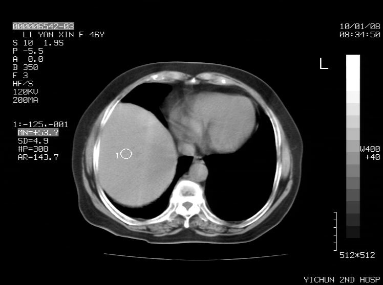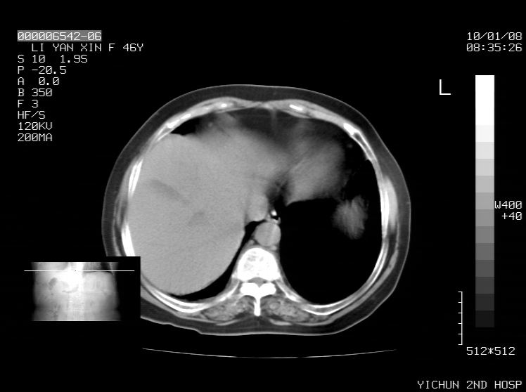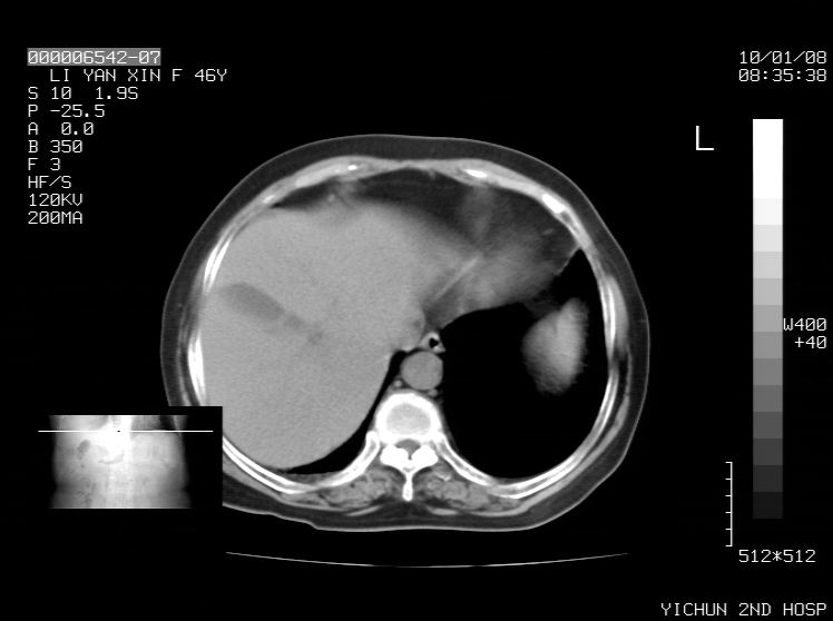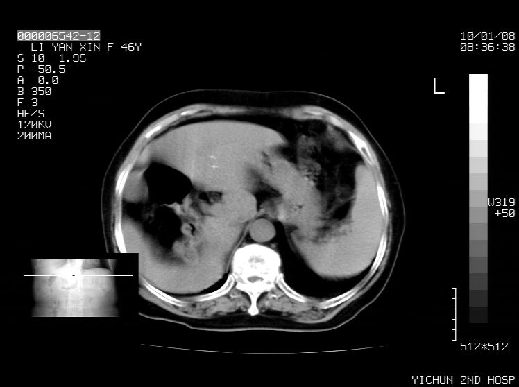 [br]右侧膈膨升,肝内钙化灶,胆囊壁厚,右侧肾脏缺如。病史?