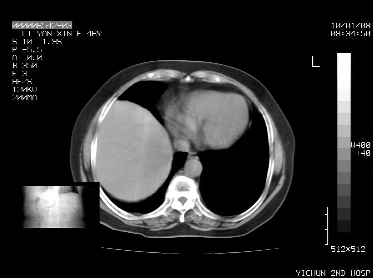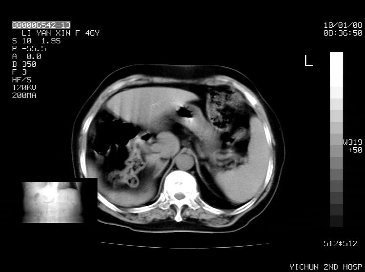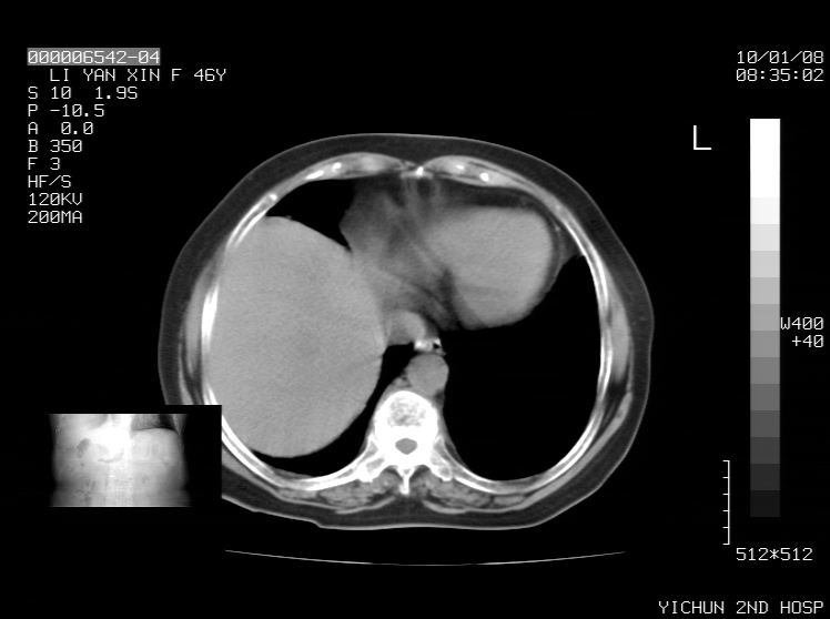 肝脏变异致膈升高,肝左叶肝内胆管结石.右肾萎缩,左肾代偿肥大.