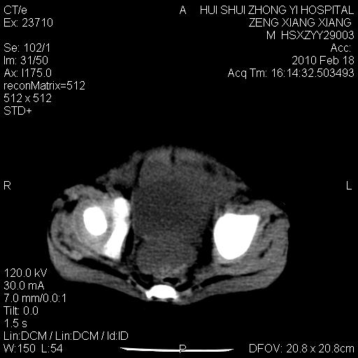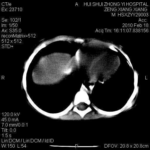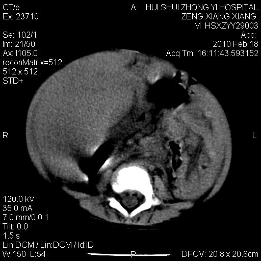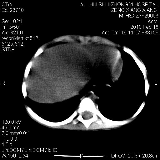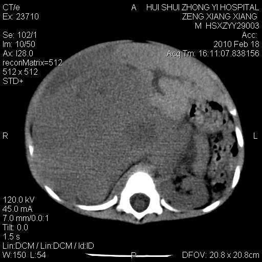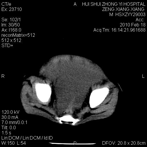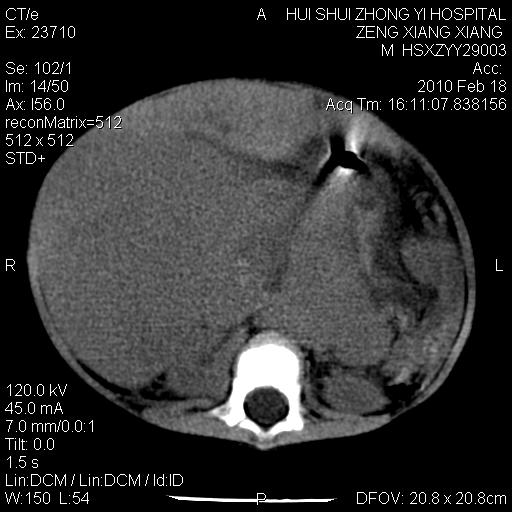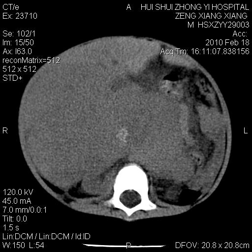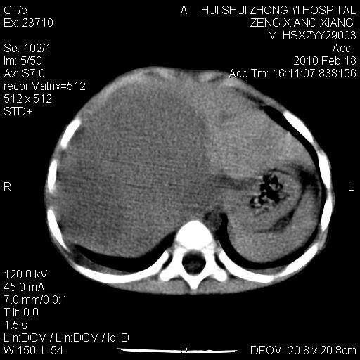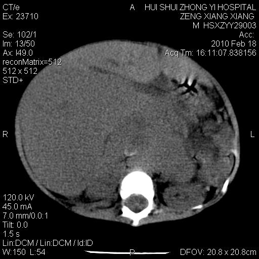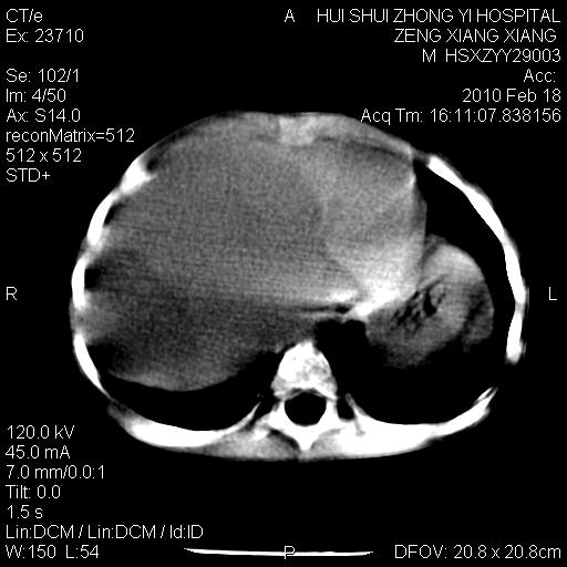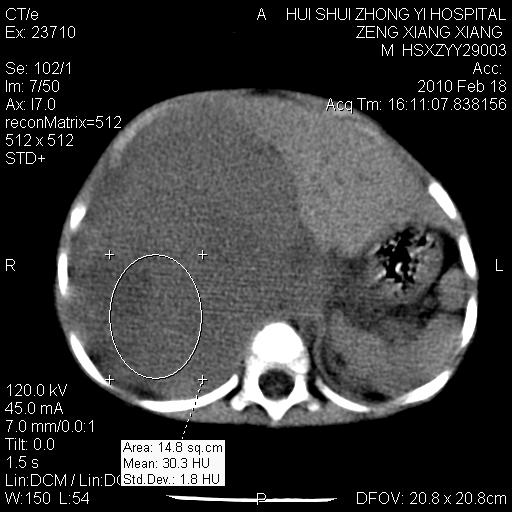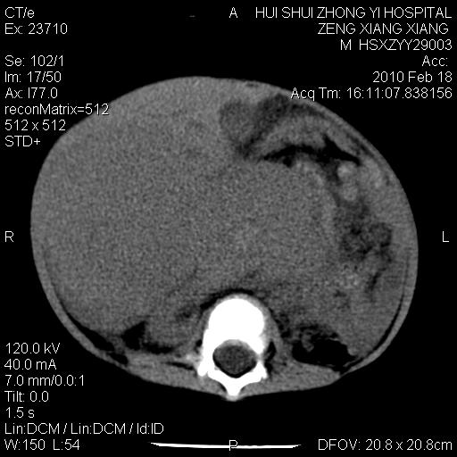 依据:年龄、有钙化,肾脏及肝脏受压移位。