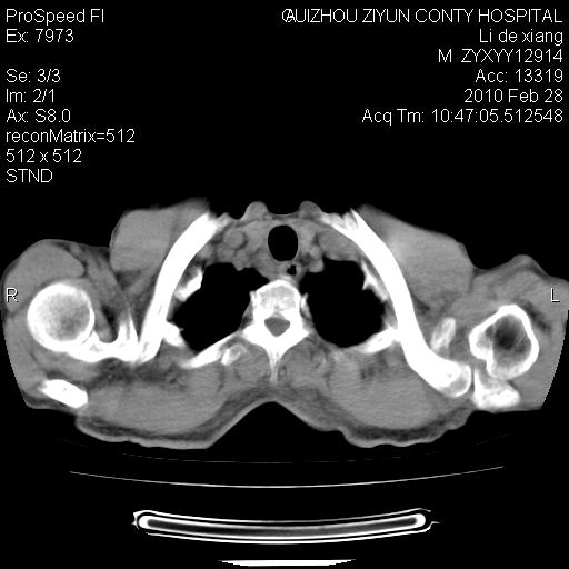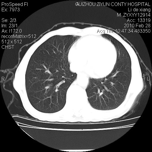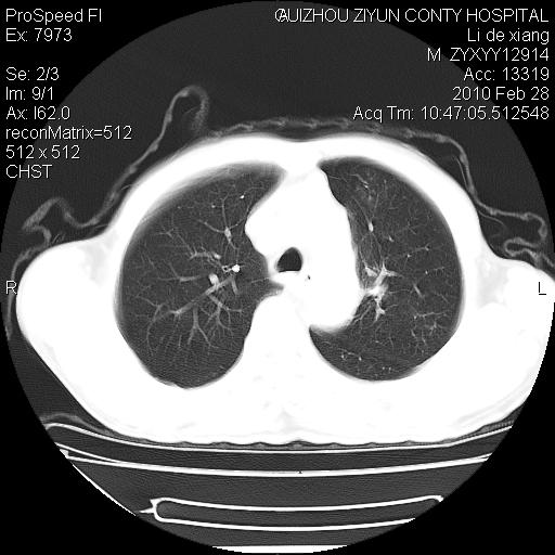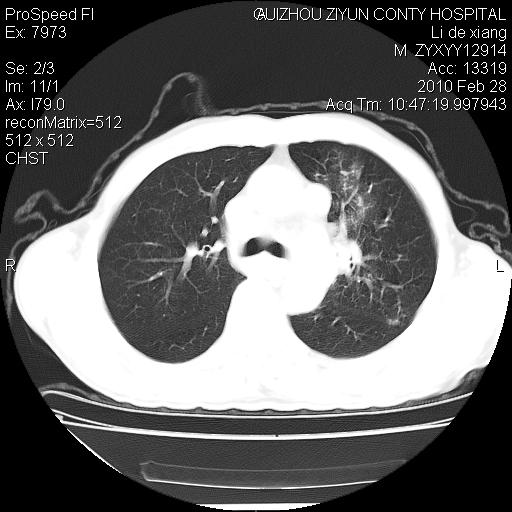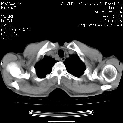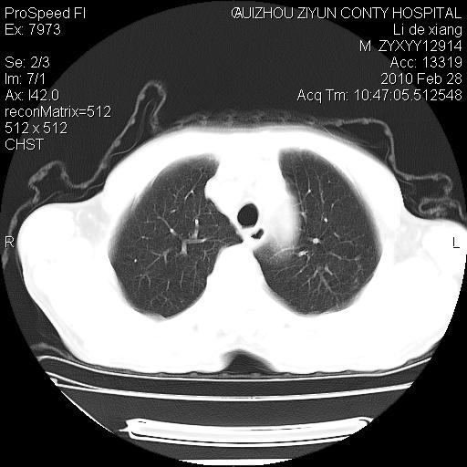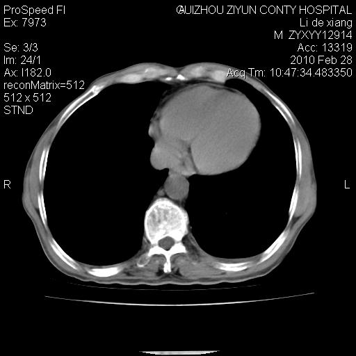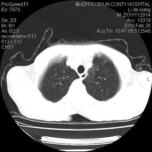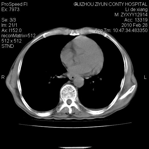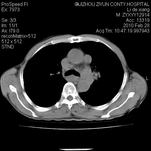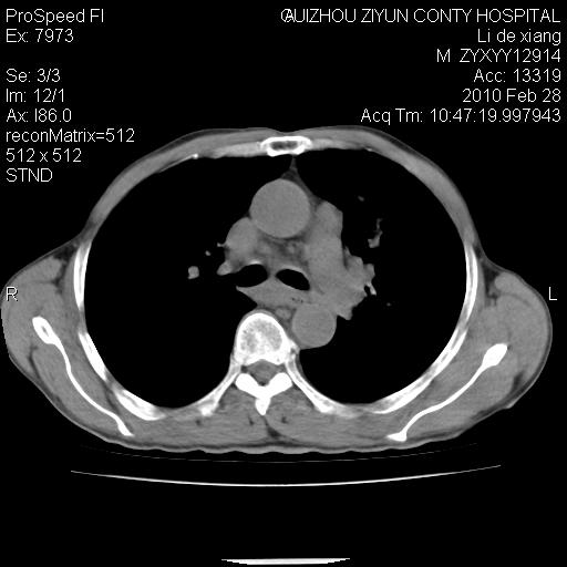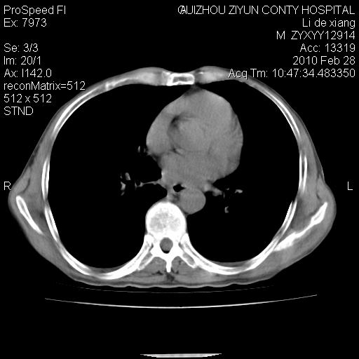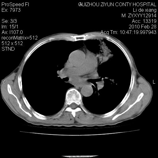 CT24776:男 71Y 咳嗽咳痰胸痛两月,伴声音嘶哑。