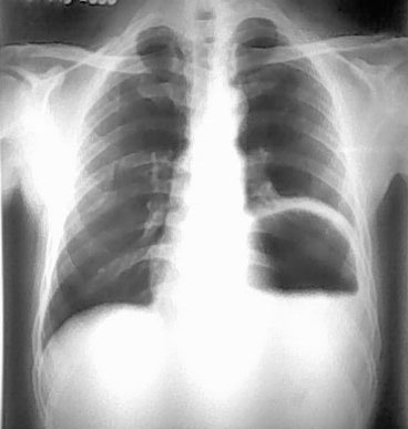 左侧膈肌抬高,其胸腔可见胃泡影,提示膈疝,建议钡餐或ct检查。