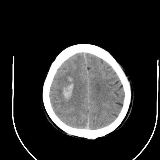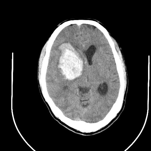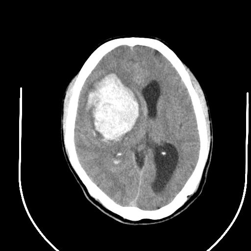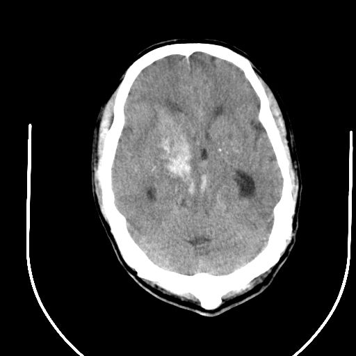 右侧基底节区脑出血并破溃入脑室。