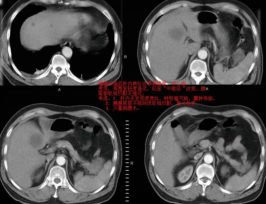 1)肝脏多发性转移瘤(不排除胰尾癌转移所致可能)。2)腹水。3)右侧少量胸腔积液。