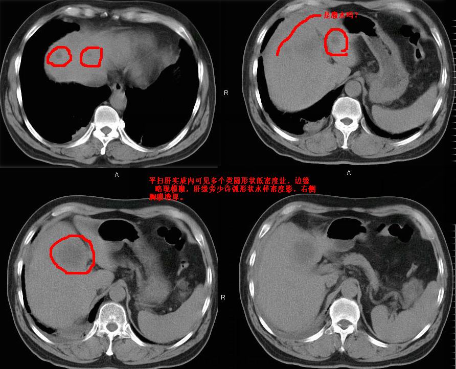 肝多发低密度灶;轻度强化,较水密度高,考虑转移,不排除肝脓肿