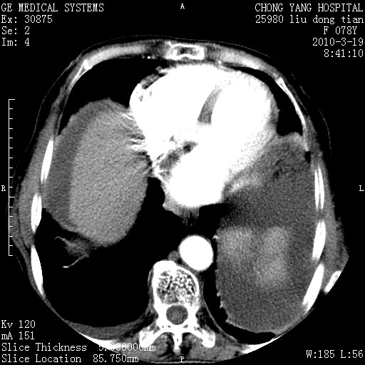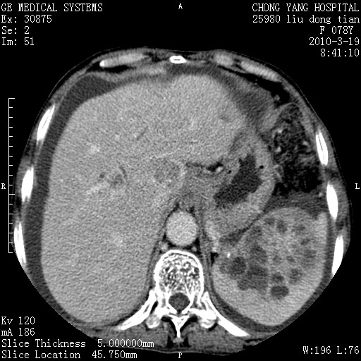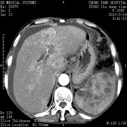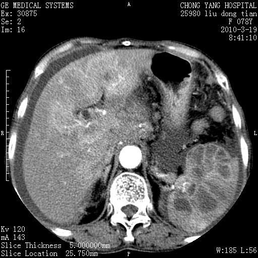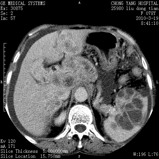 最后报的胰头癌多发转移,脾脏单独考虑囊肿或淋巴管瘤。