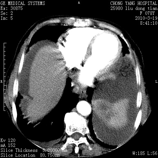 脾脏病灶无强化,像多发囊肿或淋巴管瘤,不除外淋巴瘤(低强化);