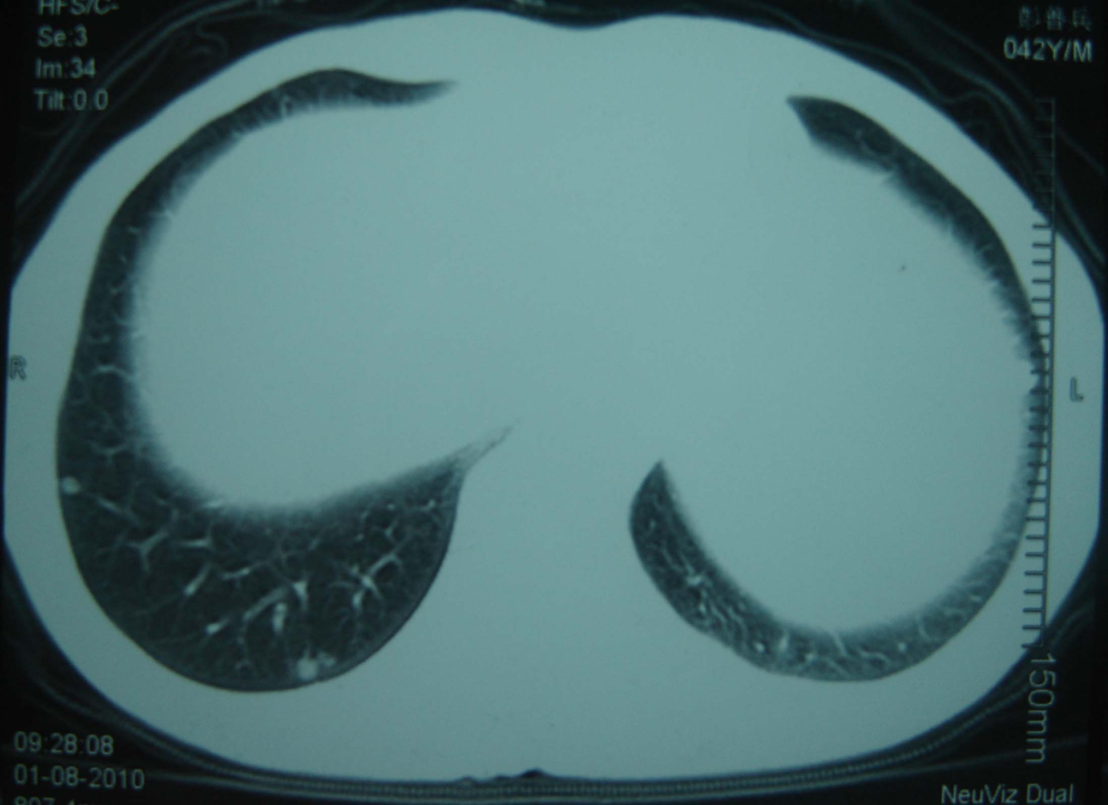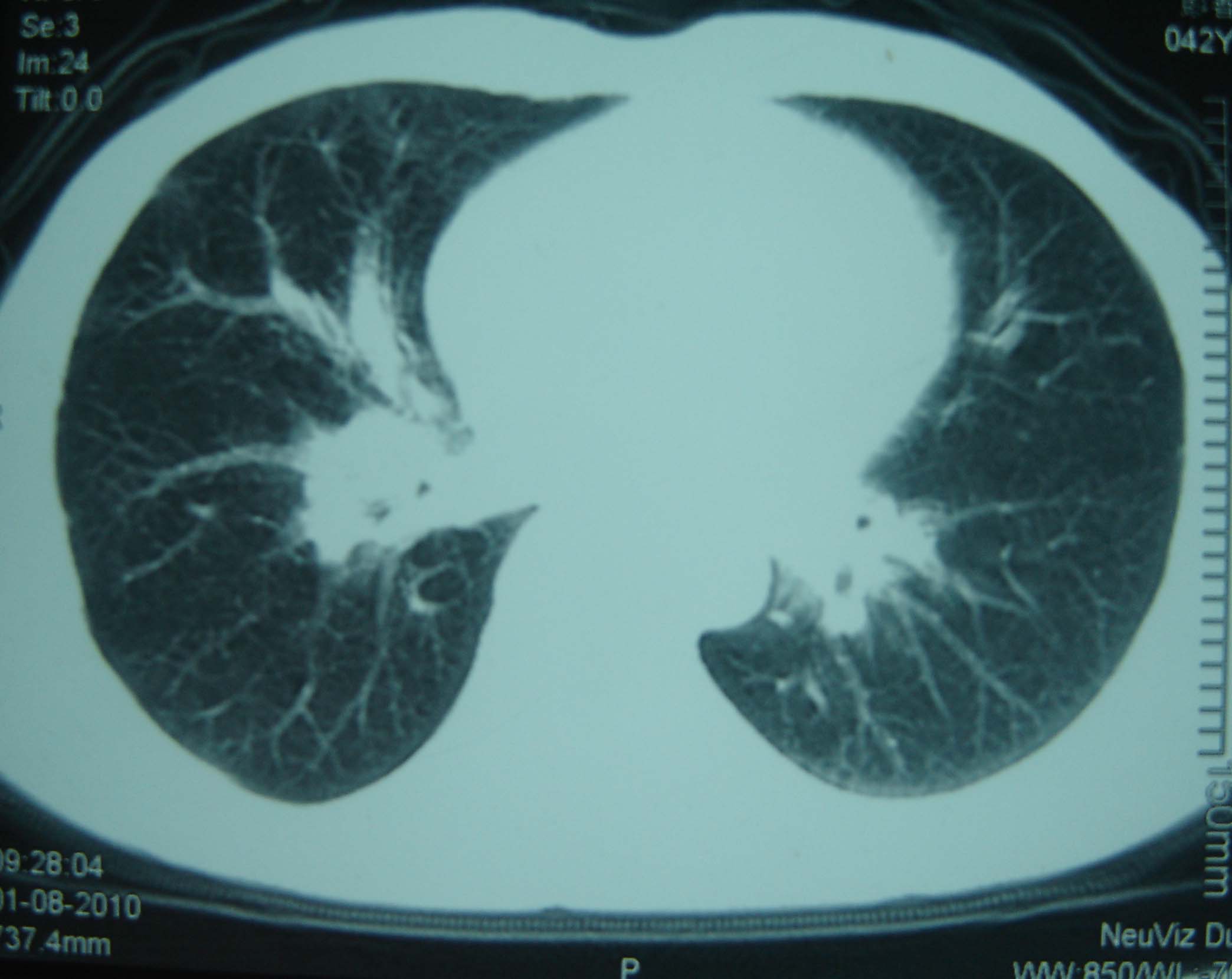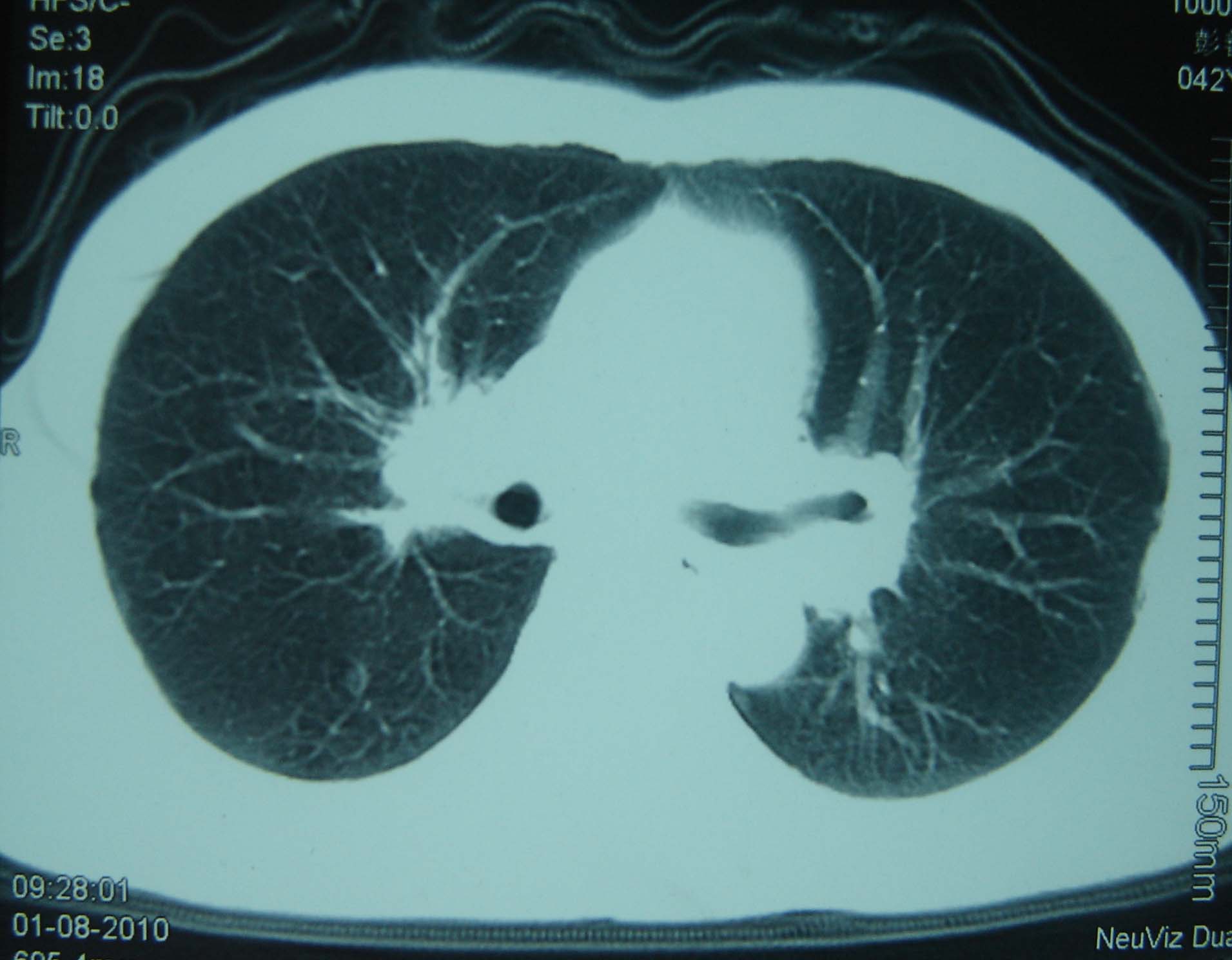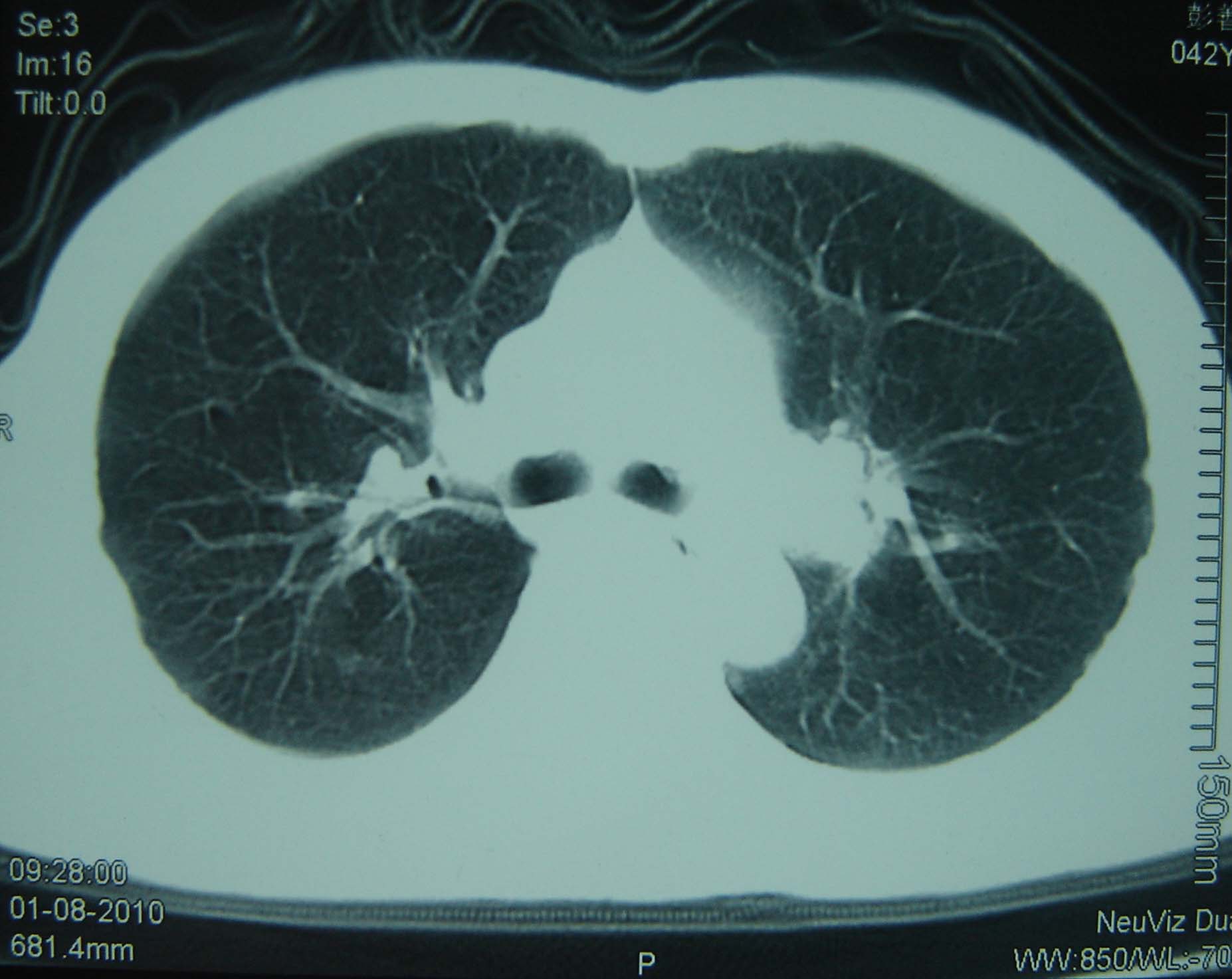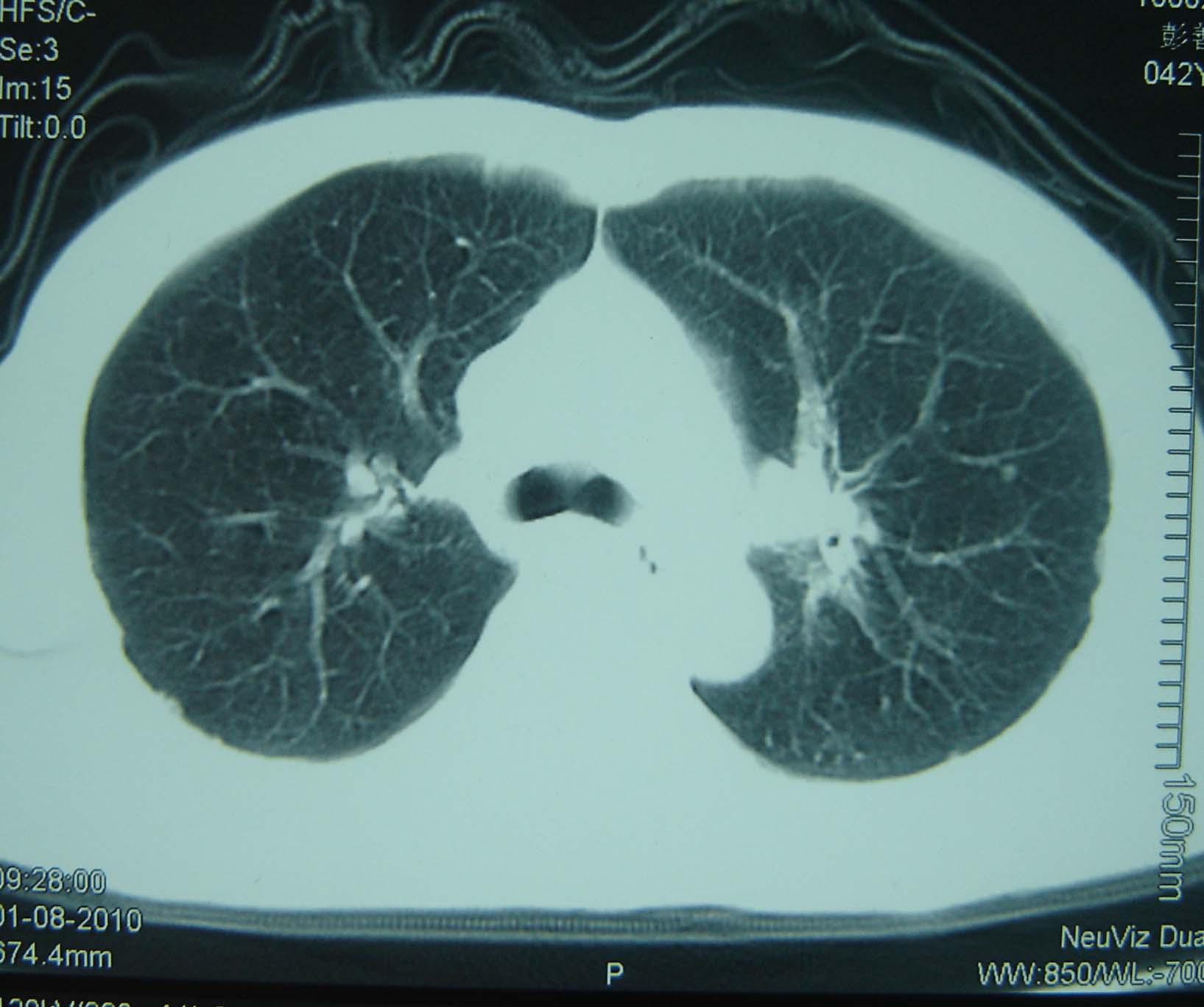 男 、43岁,咳嗽胸痛,装修工,平时接触粉尘较多,有吸烟史10多年,纤维支气管镜检查未发现异常,胃镜、腹部b超检查亦未发现异常,颈部淋巴结活检未发现肿瘤细胞。