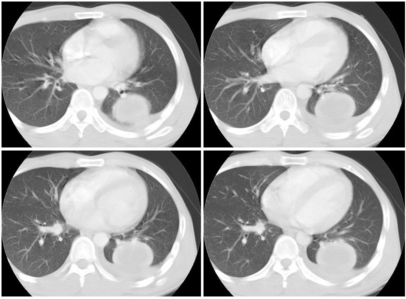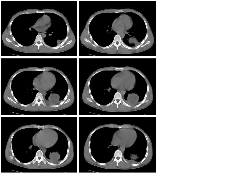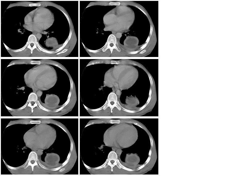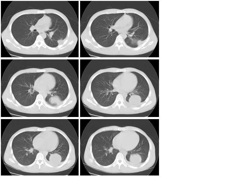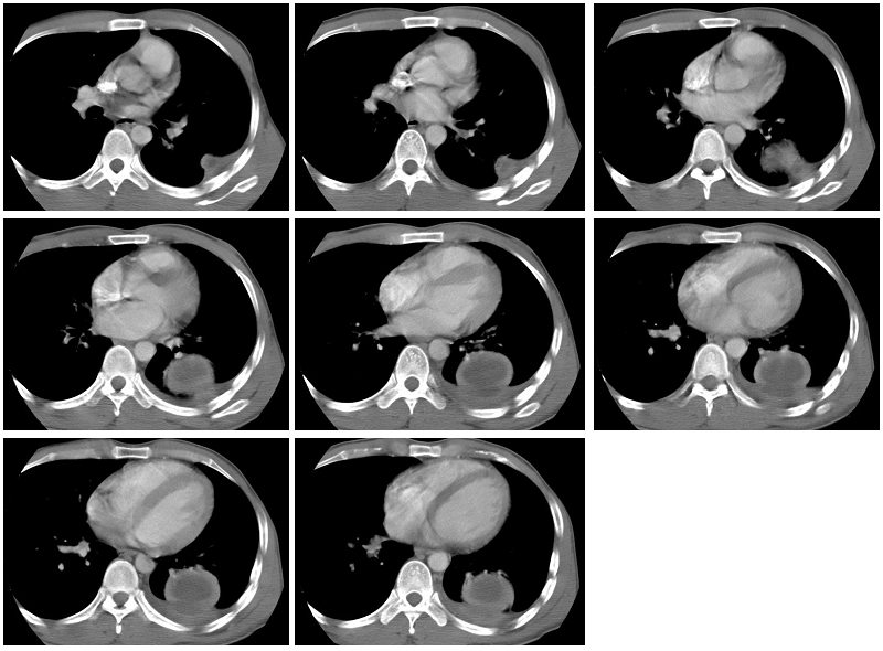 男性,34岁,咳嗽,胸痛一个月,左下肺呼吸音清。分别是肺窗(1-2),纵隔窗(3),增强动脉期(4),平衡期(5),平扫ct值为40-50hu,增强后厚壁达到80-100hu, [/color]