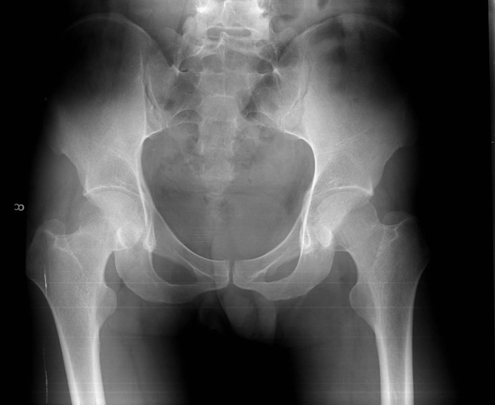 x线看到一点不对 左侧髋臼骨皮质有点欠连续!对比右侧看看