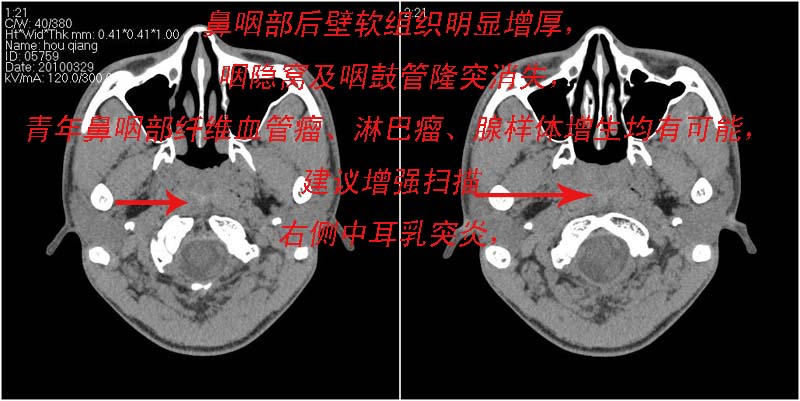 右侧中耳乳突炎累及外耳道,鼻咽腺样体肥大。