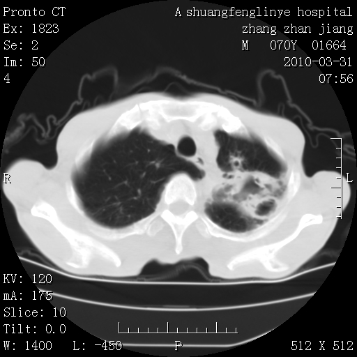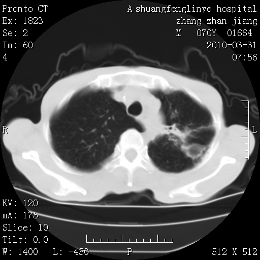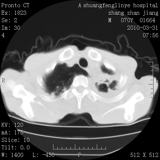 支持:继发性肺结核伴空洞形成!建议纤支镜检查待出外周围型肺癌可能!