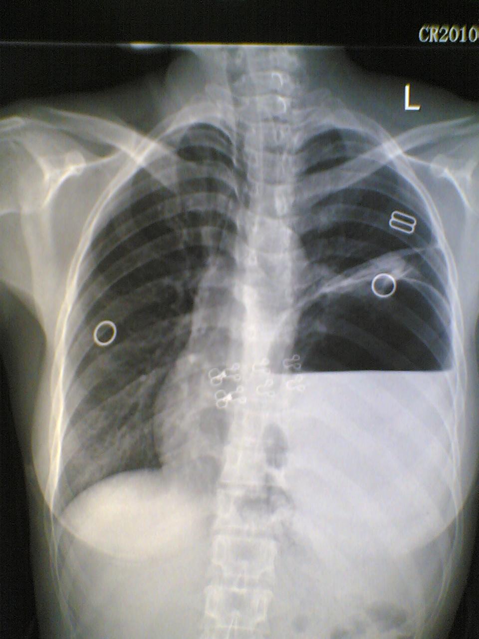 1)考虑左侧膈疝。2)左下肺盘状肺不张。支持!应该做钡餐或透视进一步检查。