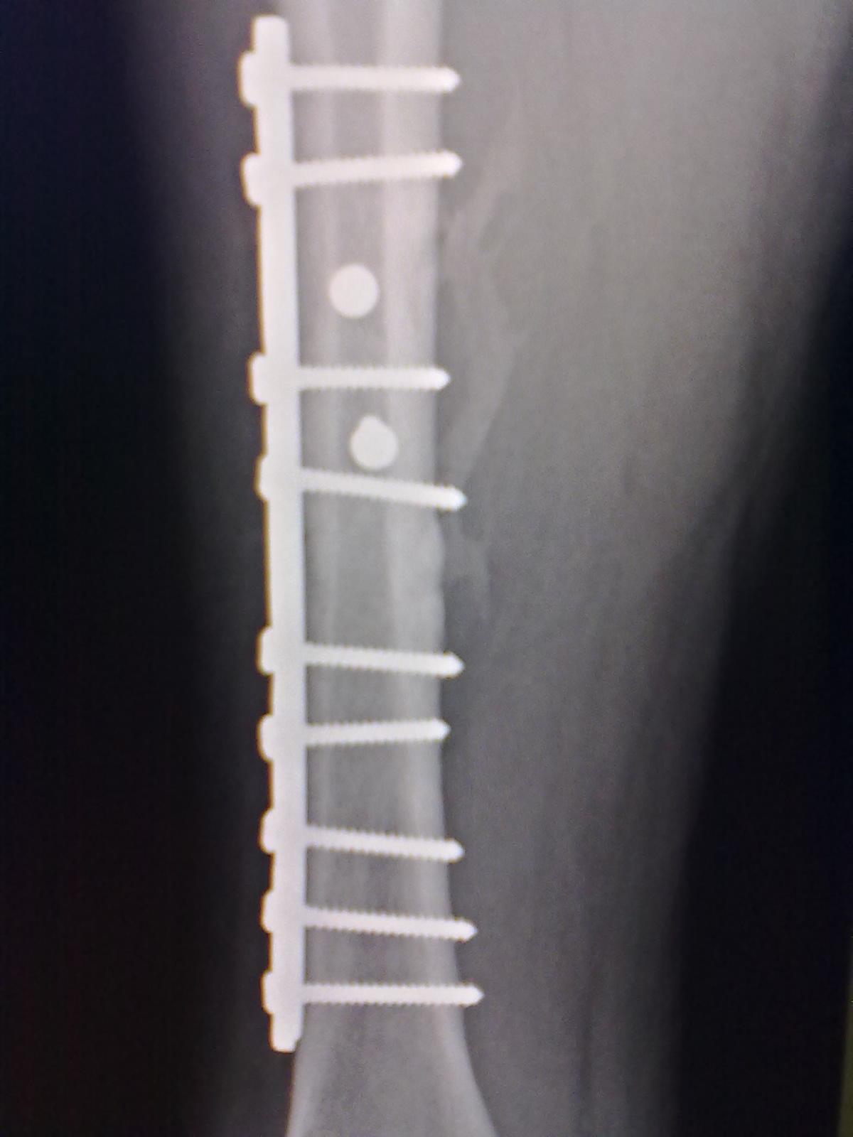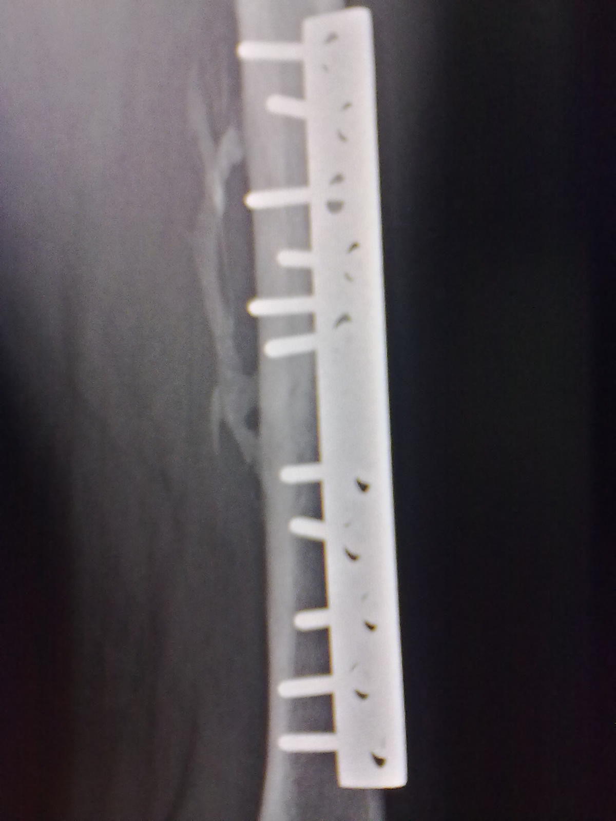 X7065:M,30Y。股骨骨折内固定术后5个月复查片。