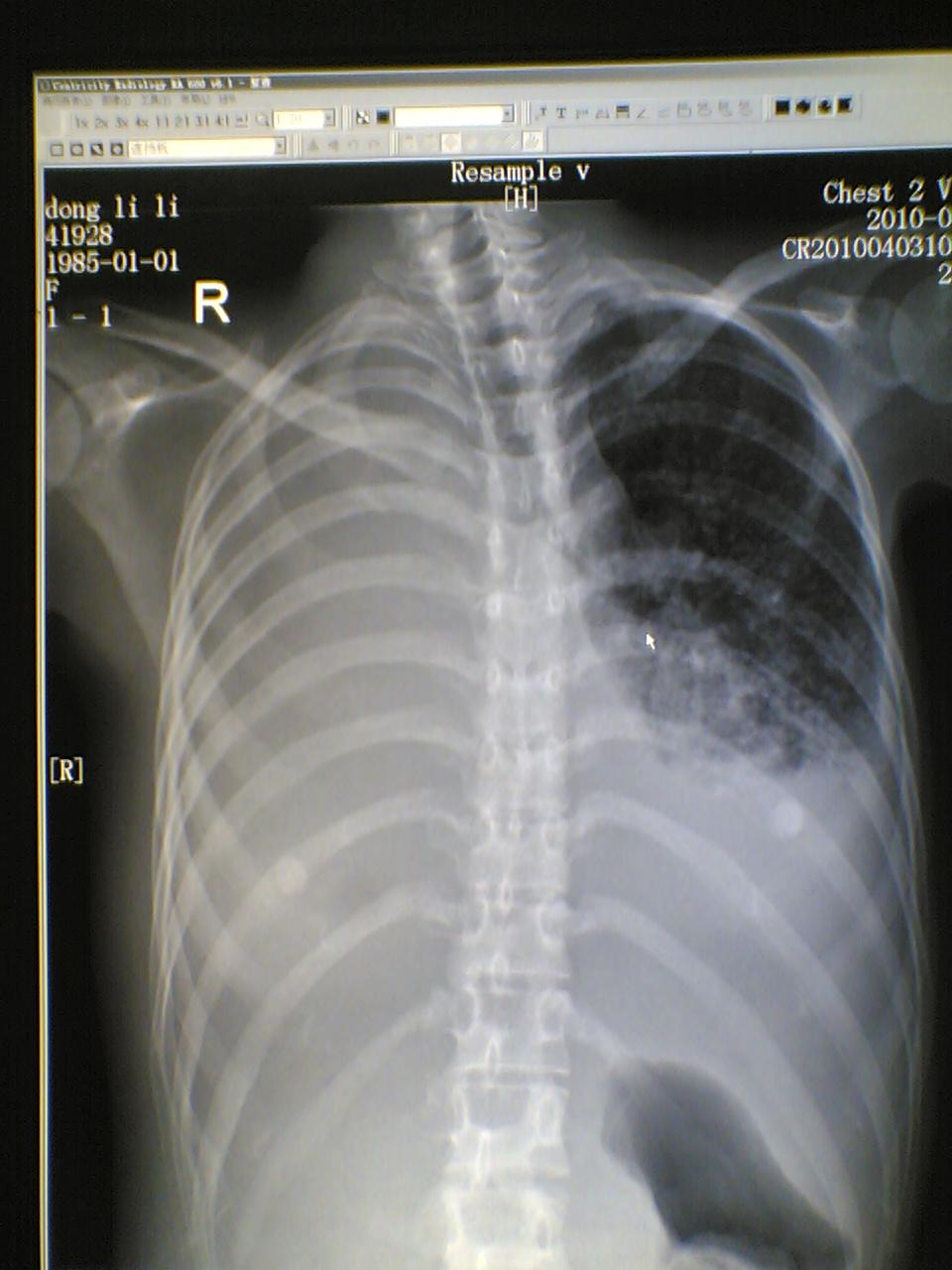 以下是引用随光逐影在2010-4-3 19:58:00的发言:[br]考虑左肺结核,右侧肺毁损;左侧胸腔积液。[br]建议:行ct扫描检查。