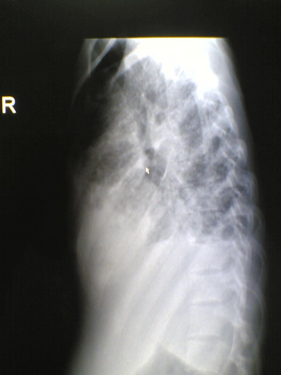 病人年轻,病史较长1年,还是考虑慢性病 结核了, 侧位看上肺也有片絮状病变,当然要做个ct ,估计右侧为实变和胸腔积液