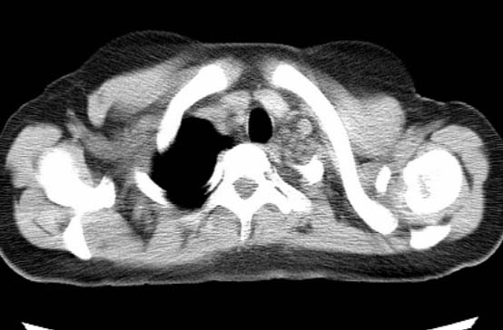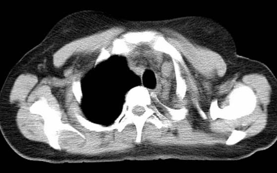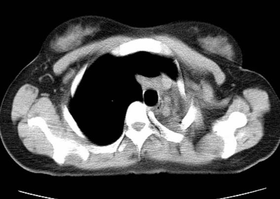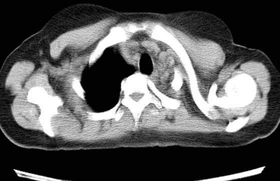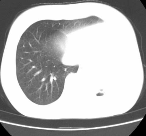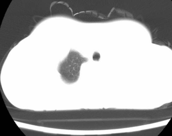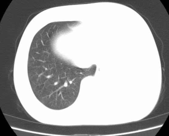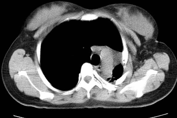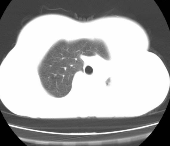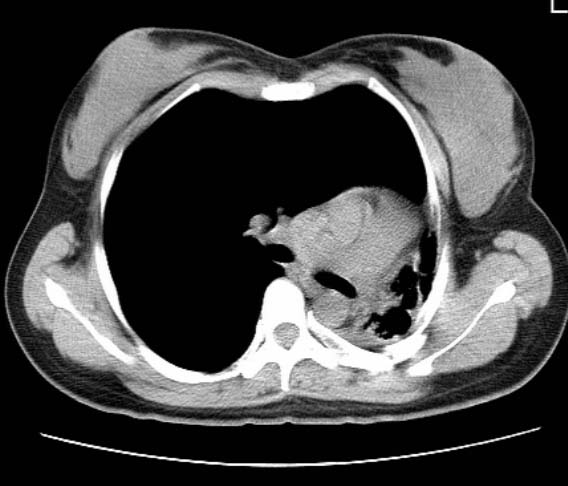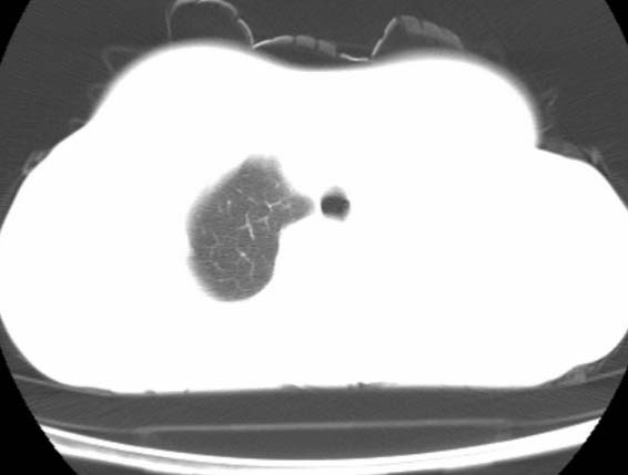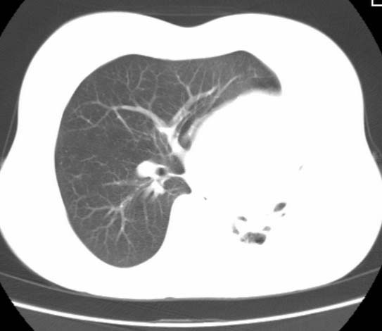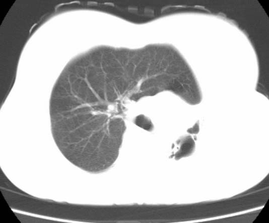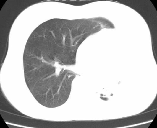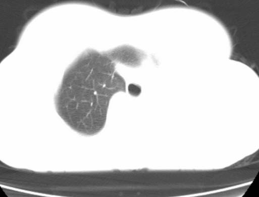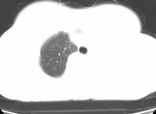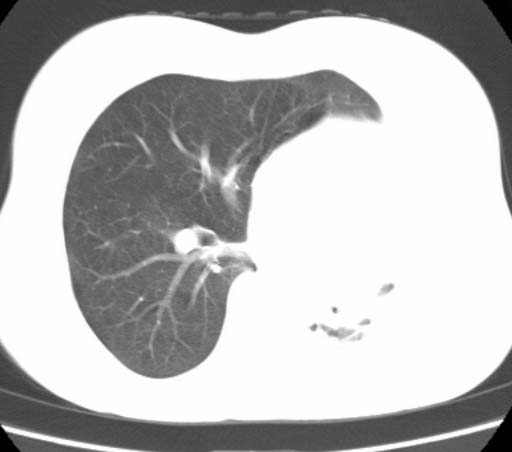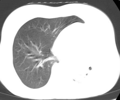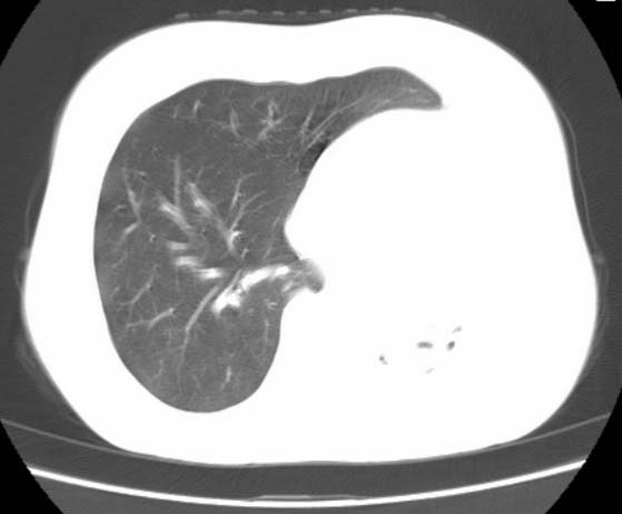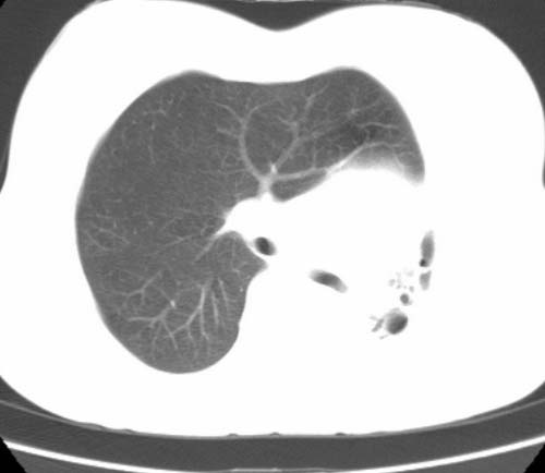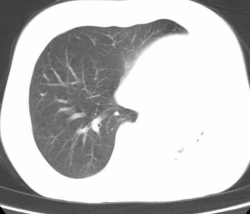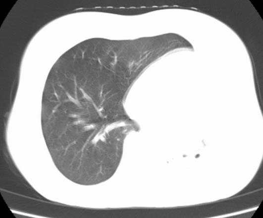 女 20岁。一月前咳血,诊“肺结核”抗痨治疗一月后,咳血停止,现复查。病人精神好。前后ct片对比未见明显变化。既往体检“正常”