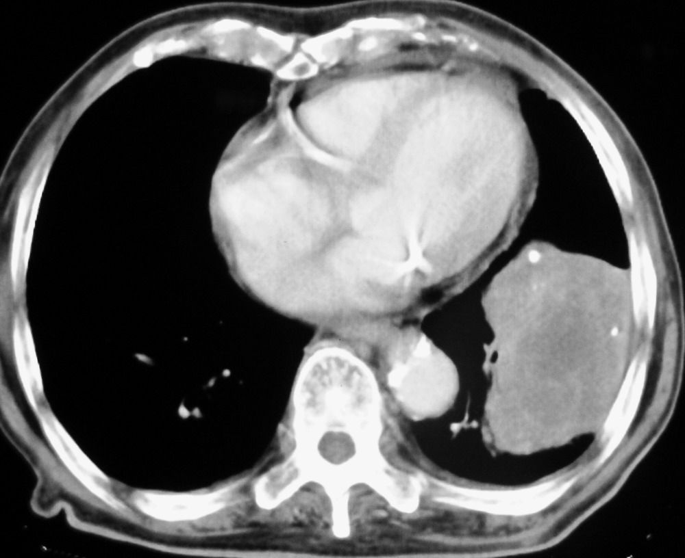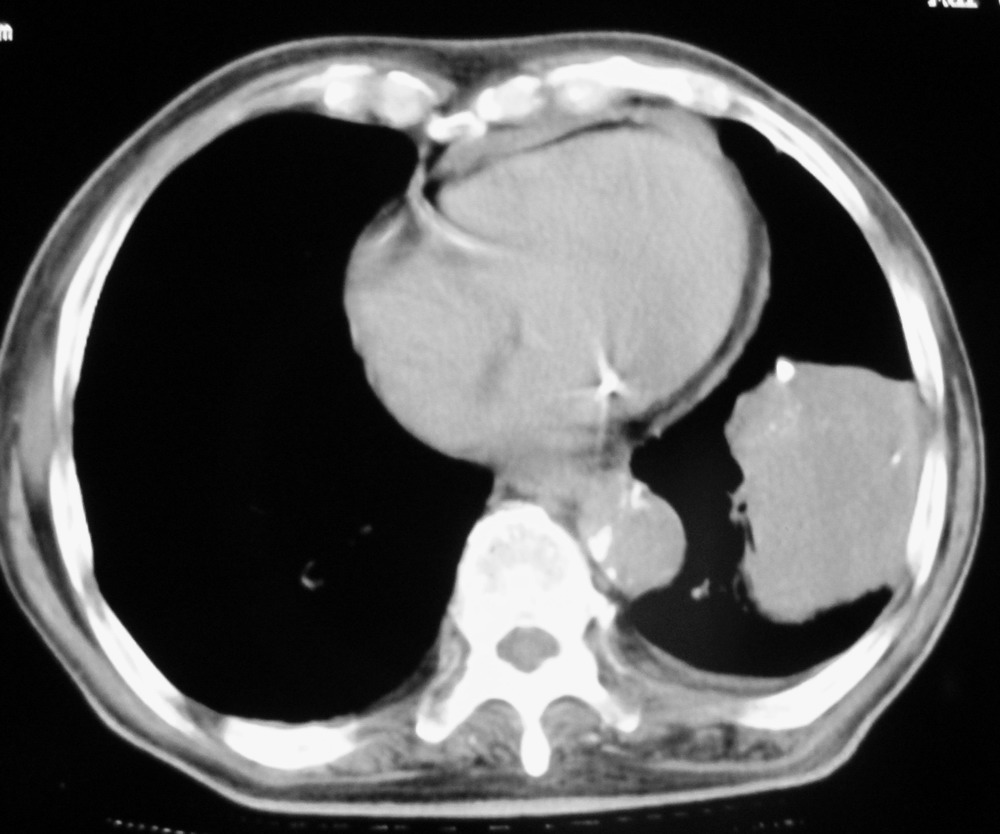 1)左肺下叶软组织肿块,不排除周围型肺癌可能。2)左侧少量胸腔积液。3)心包积液。4)冠状动脉及主动脉钙化。