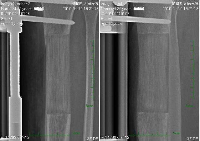 以下是引用随光逐影在2010-4-11 11:15:00的发言:[br]1)左胫骨下端骨折内固定术后;左腓骨下端粉碎性骨折。2)右侧胫骨中上段保留骨膜的截骨骨延长术后。
