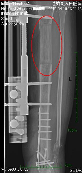 该患者车祸致小腿多发性骨折行内固定术后。因胫骨上段骨折处事后感染再行病灶段截取,采用外延长支架牵拉骨延长术,逐步牵拉已一年余,所见延长段长8.8cm(图文工作站上所测),并无自体植骨或人工材料充填。此次为遵嘱拍片寄往上海某施术医院复查。