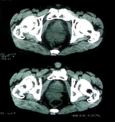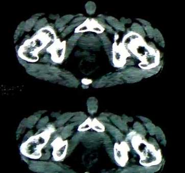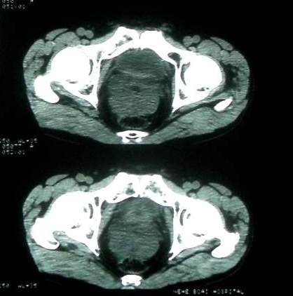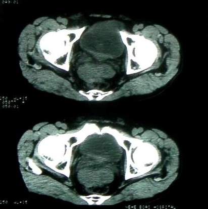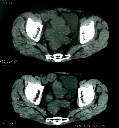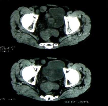 前列腺肥大,密度不均。伴盆腔实性肿块。考虑前列腺癌伴盆腔转移。建议增强扫描。