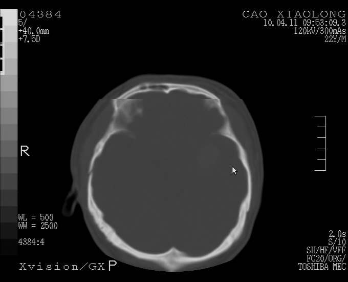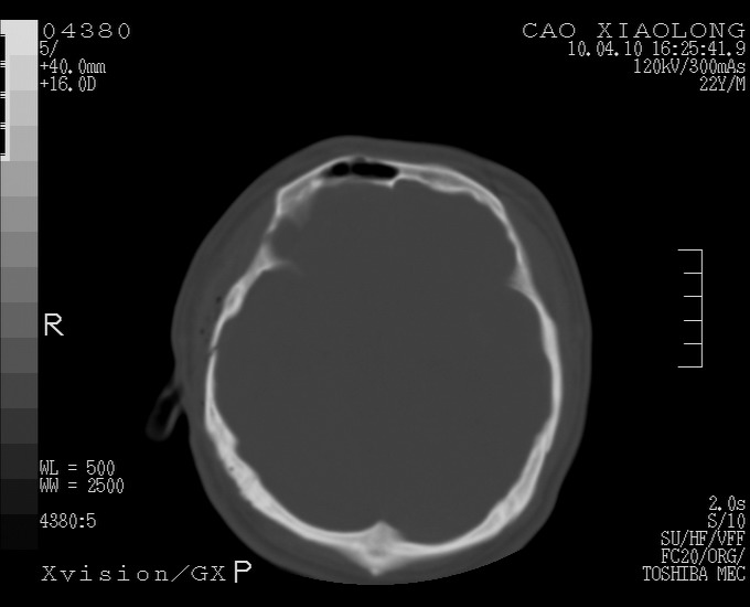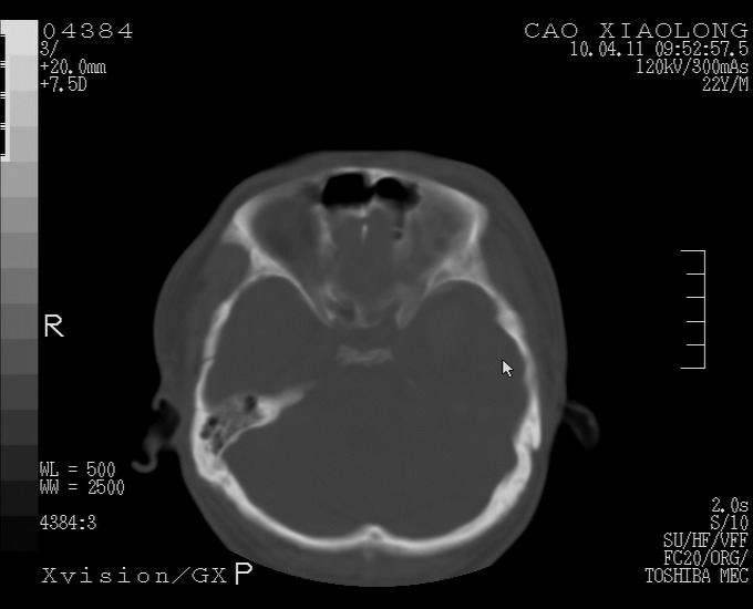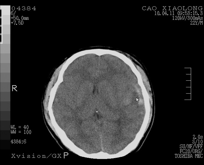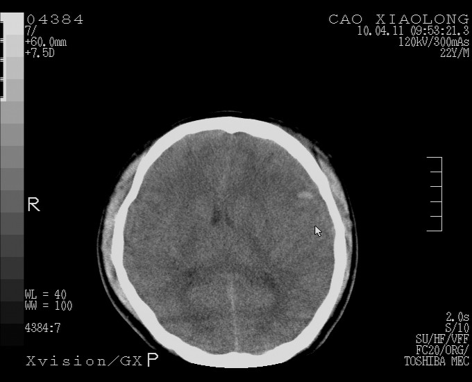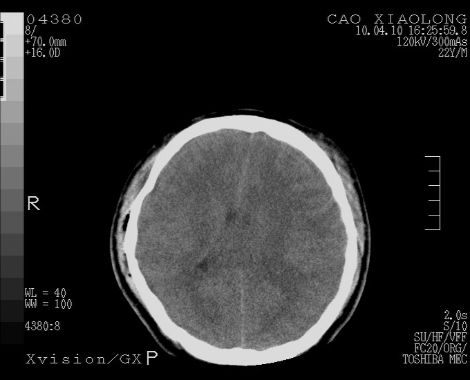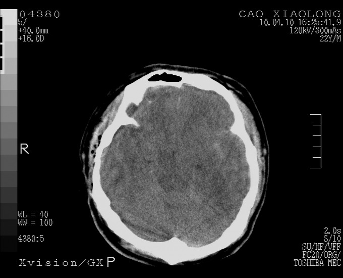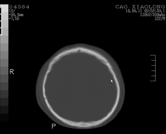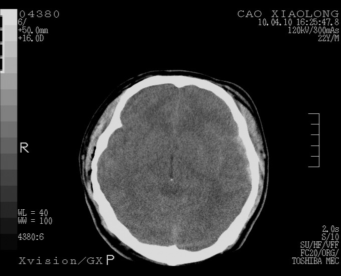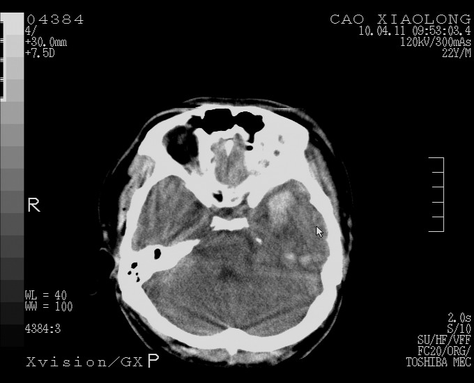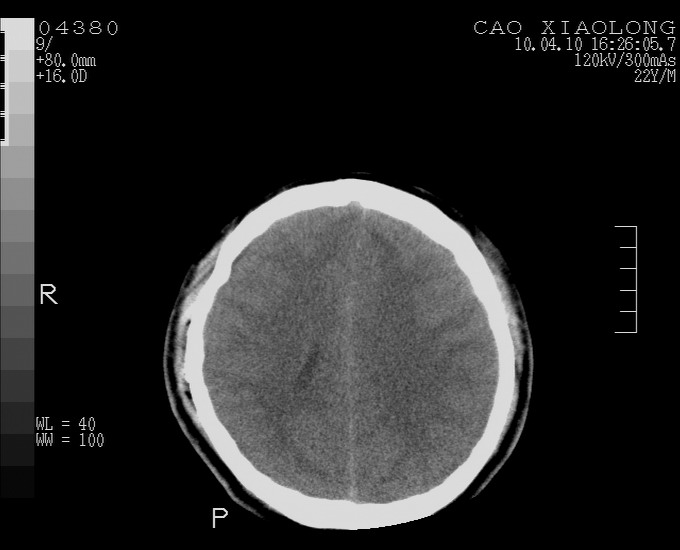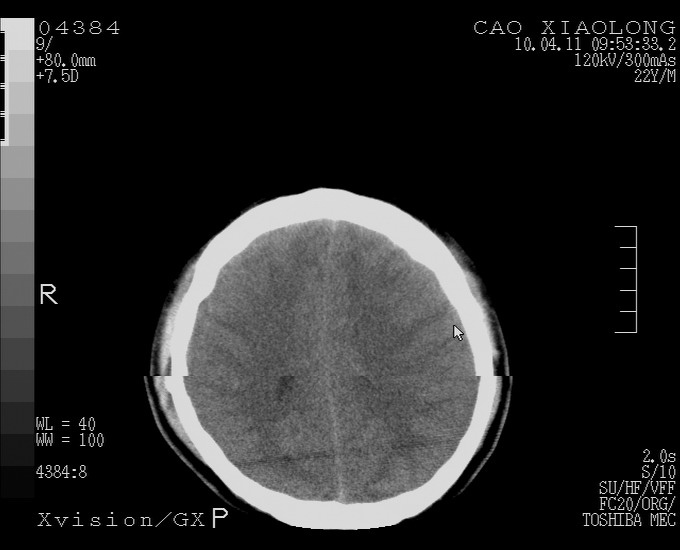 以下是引用随光逐影在2010-4-11 11:00:00的发言:[br]1)左侧额颞顶部硬膜下血肿。2)蛛网膜下腔出血。3)右侧颞顶部颅骨线形骨折。[br][br]20小时后复查:左侧额颞叶脑挫裂伤;左侧额颞顶部硬膜下血肿及蛛网膜下腔出血有吸收表现;右侧颞顶部颅骨线形骨折。[br]