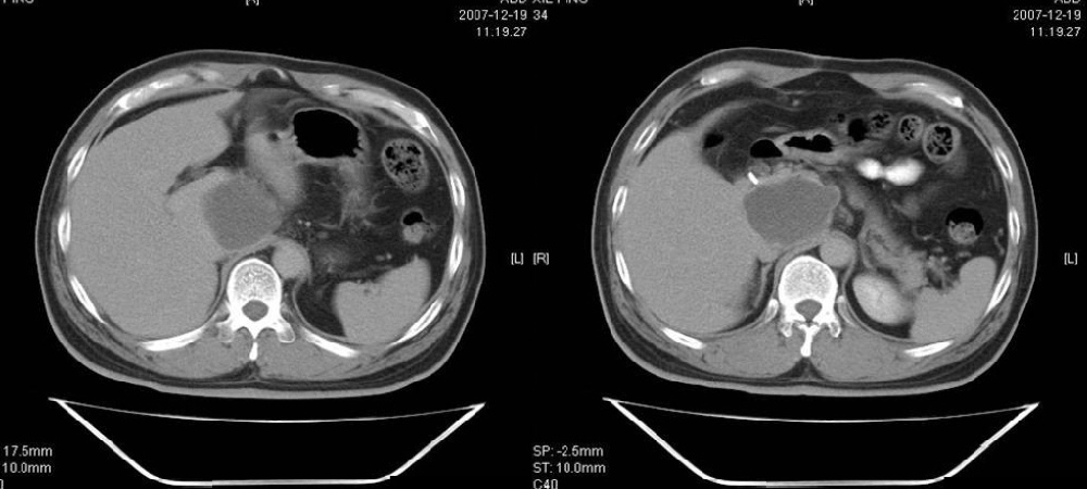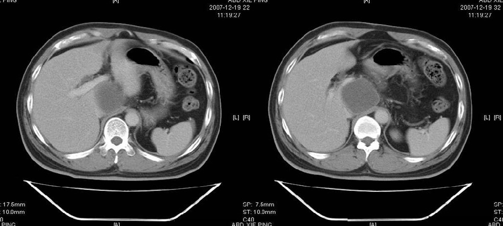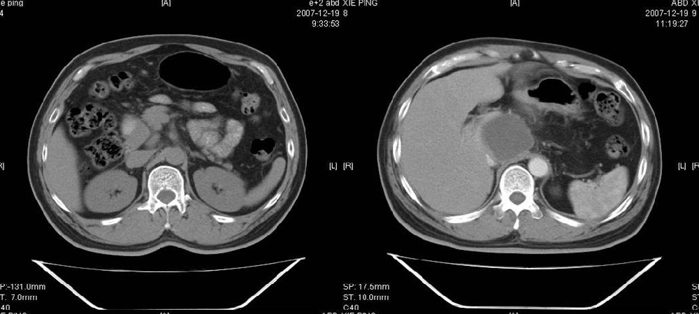 胰腺头部低密度囊性病灶,边缘清楚,增强后囊壁略强化。考虑:胰头假性囊肿!