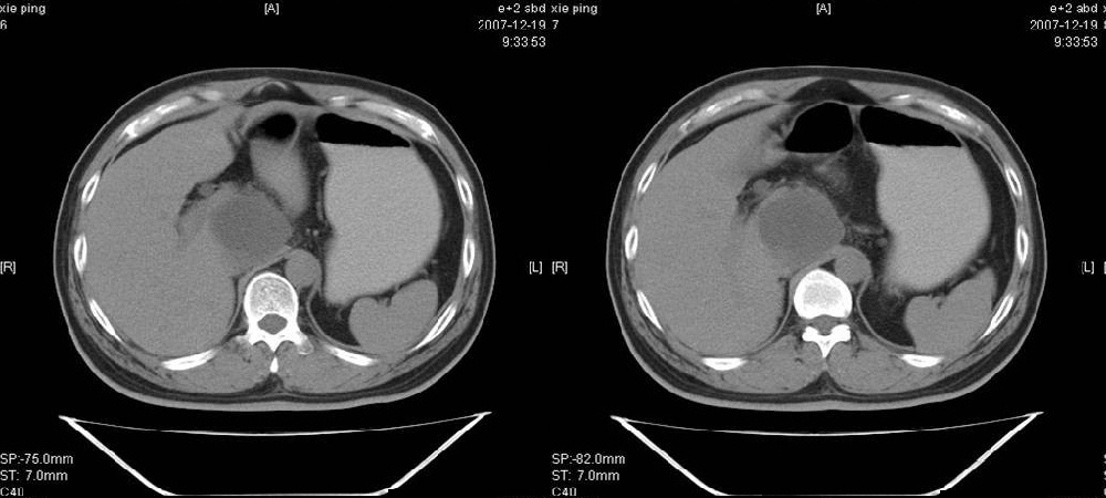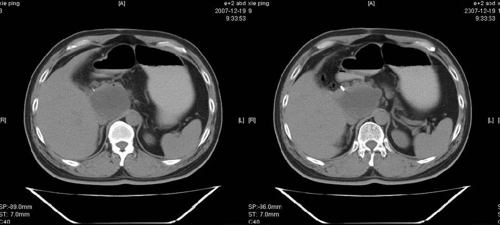 临床病史:患者,男,53岁,因反复上腹部饱胀不适2+月,在餐后或饥饿时明显,伴呃逆,无呕吐、呕血,无腹痛腹泻;2年前腹腔镜胆囊切除,否认肝炎、结核等病史。