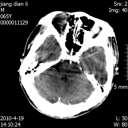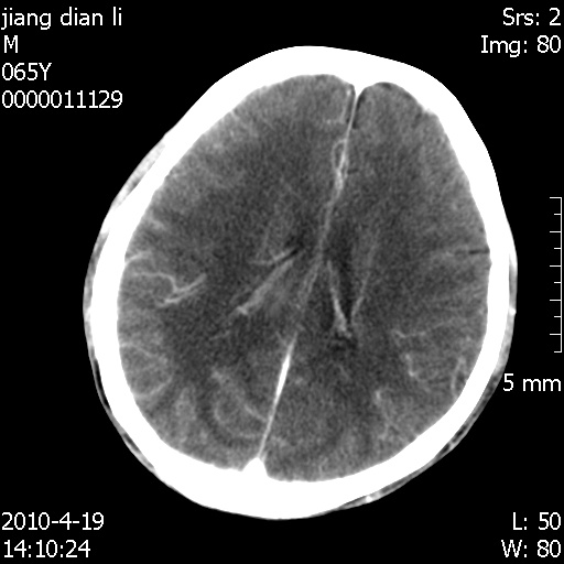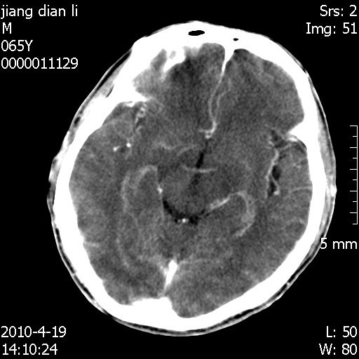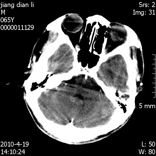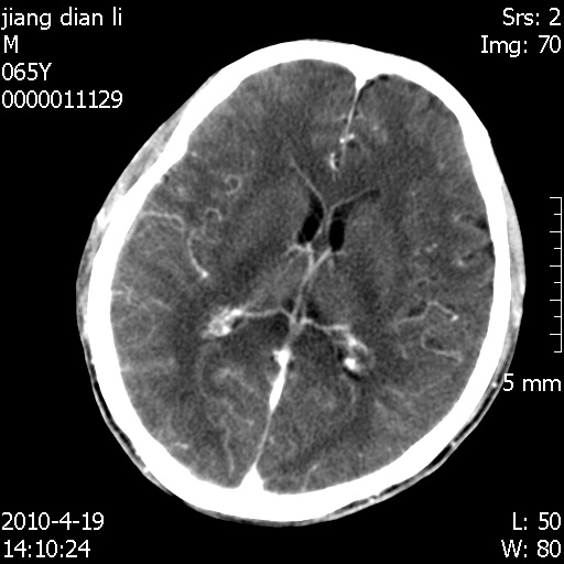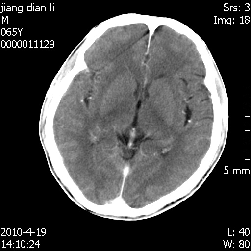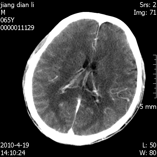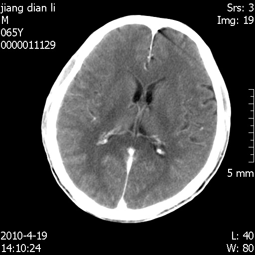遗憾! 复习了复查片:发现顶叶出血灶破入侧脑室,侧脑室体部见少许高密度。